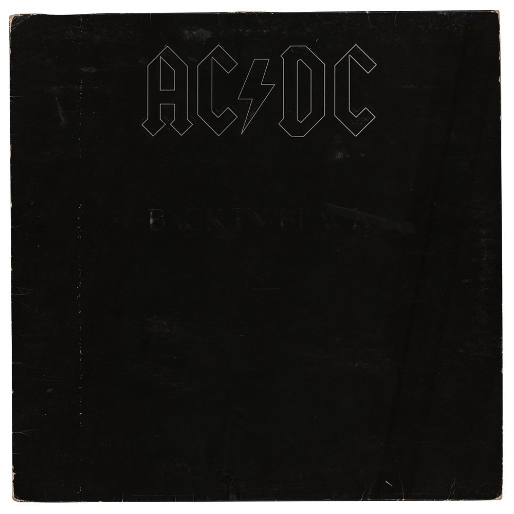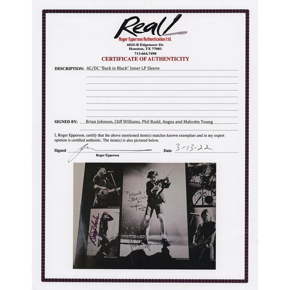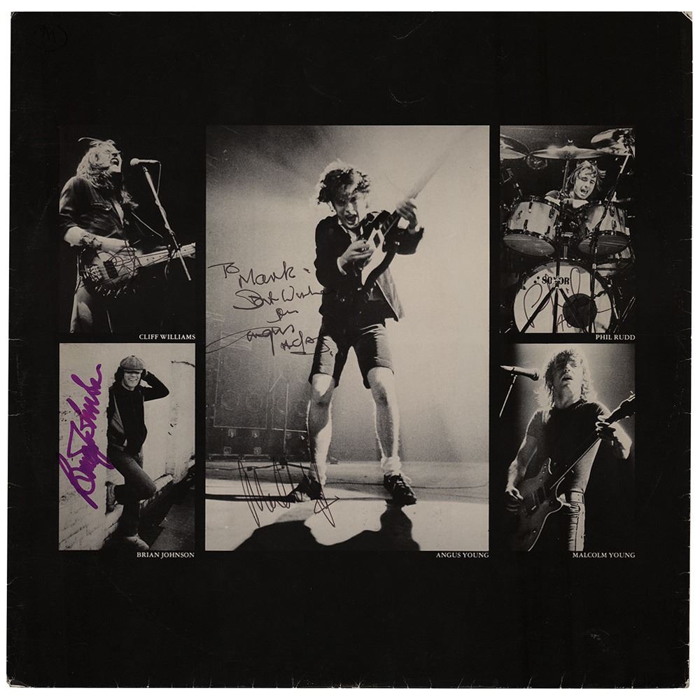 Back in Black album signed and inscribed on the inner sleeve in felt tip, "To Mark, Best Wishes from Angus, AC/DC," "Malcolm Young," "Phil Rudd, AC/DC," "Cliff Williams," and "Brian Johnson." In very good to fine condition, with light scuffing to the cover, moderate contrast to the Williams and Rudd signatures, and a small "M" annotated in ink in the upper left corner of the sleeve. Accompanied by a full letter of authenticity from REAL. A fantastic, fully signed example of the band's first album to feature lead singer Brian Johnson, following the death of original frontman Bon Scott.