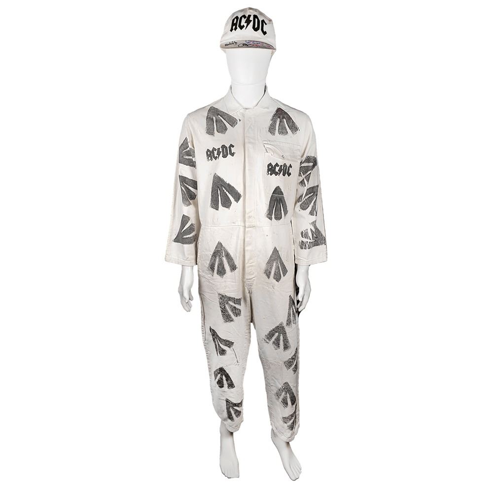 A boiler suit and cap worn by an extra during the filming of the AC/DC music video ‘Are You Ready' at London's Wembley Stadium in April 1991, with the off-white snapback AC/DC logo cap signed on the brim in various colored ballpoint and felt tip by Brian Johnson, Angus Young, Malcolm Young, Cliff Williams, and Chris Slade. The full-length snap-button boiler suit (108 cm, likely size large) is stamped “AC/DC†on the right chest, and the rest of the suit is covered with large arrow-like stamp marks. In very good to fine condition, with some staining to the cap.