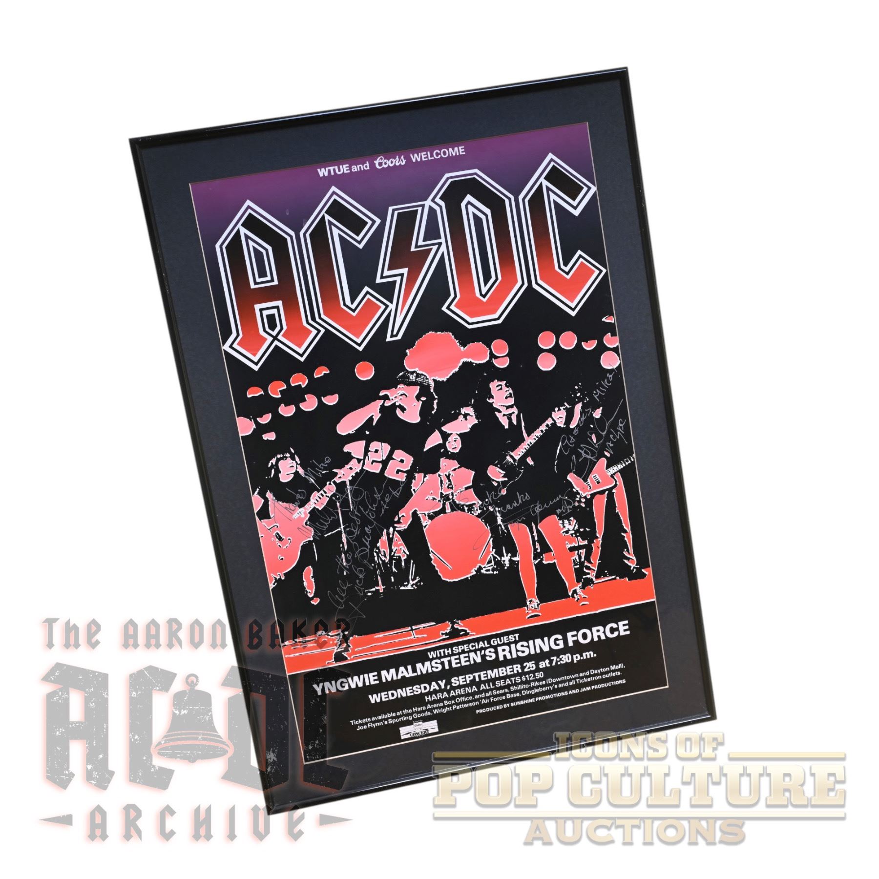 Offered here is an original AC/DC concert poster promoting their performance with special guest Yngwie Malmsteen’s Rising Force at the Hara Arena on Wednesday, September 25th. The poster prominently features the AC/DC logo and live imagery of the band, with sponsorship noted by WTUE and Coors. Measuring approximately 21.5" x 14" (framed to 25" x 17"), this striking piece has been hand-signed by four iconic members of AC/DC: Malcolm Young, Brian Johnson, Angus Young, and Cliff Williams. The combination of bold artwork, event-specific details, and autographs from this legendary lineup makes it a standout collectible for any serious AC/DC fan or rock memorabilia enthusiast.