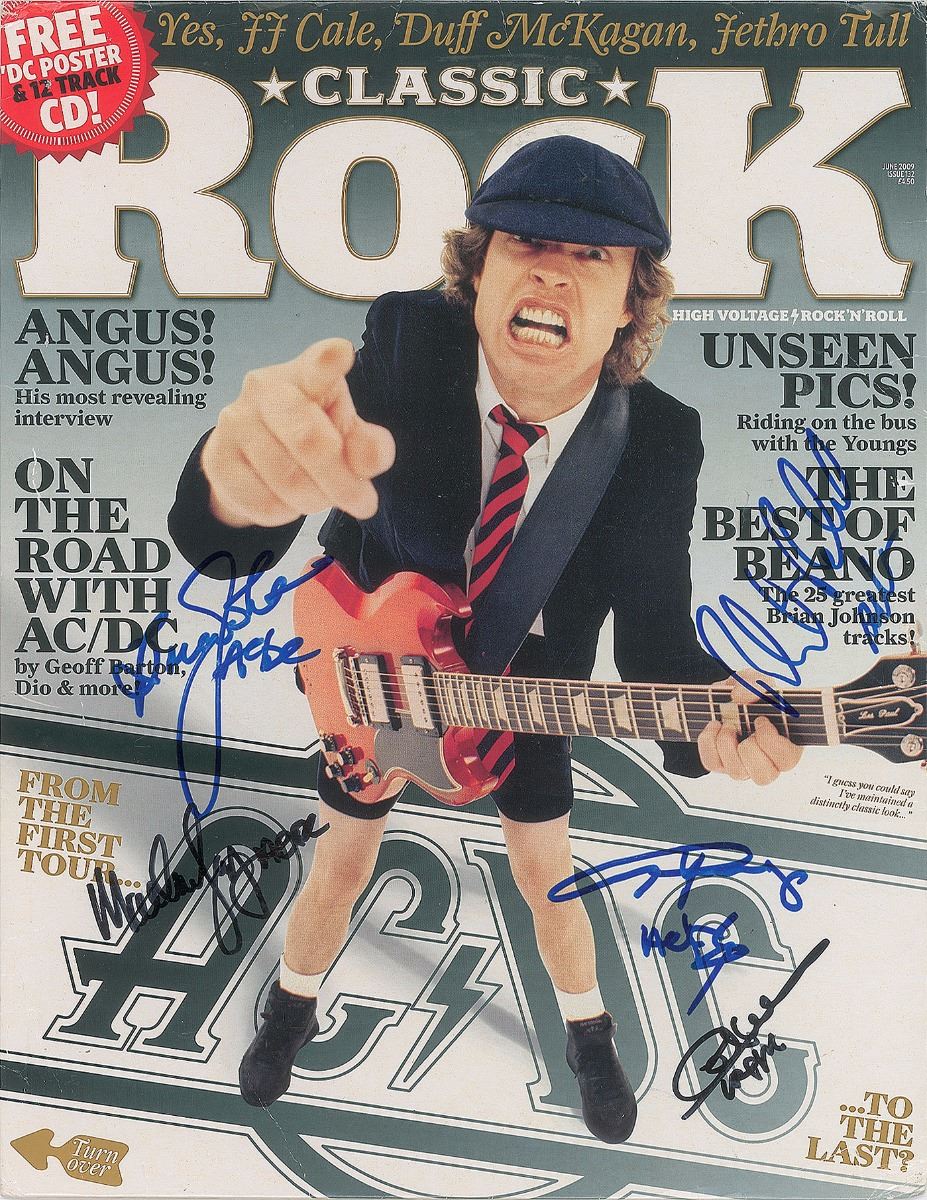 Uncommon Classic Rock magazine sleeve for issue 132, dated June 2009, depicting Angus Young standing on the front cover with his red Les Paul guitar, 10 x 13, signed on the front in blue or black felt tip by Angus and Malcolm Young, Cliff Williams, Phil Rudd, and Brian Johnson, with each adding “AC/DC.” In fine condition.