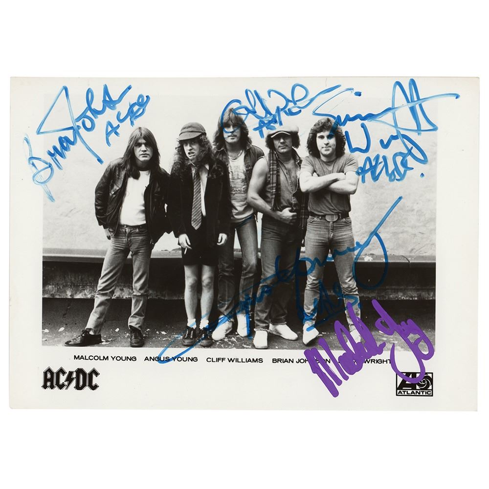 Glossy 7 x 5 Atlantic Records publicity photo of Australian rockers AC/DC, signed in blue felt tip by Brian Johnson, Cliff Williams, Angus Young, and Simon Wright, and in purple paint pen by Malcolm Young, with all adding "AC/DC" after their autograph. In fine condition.