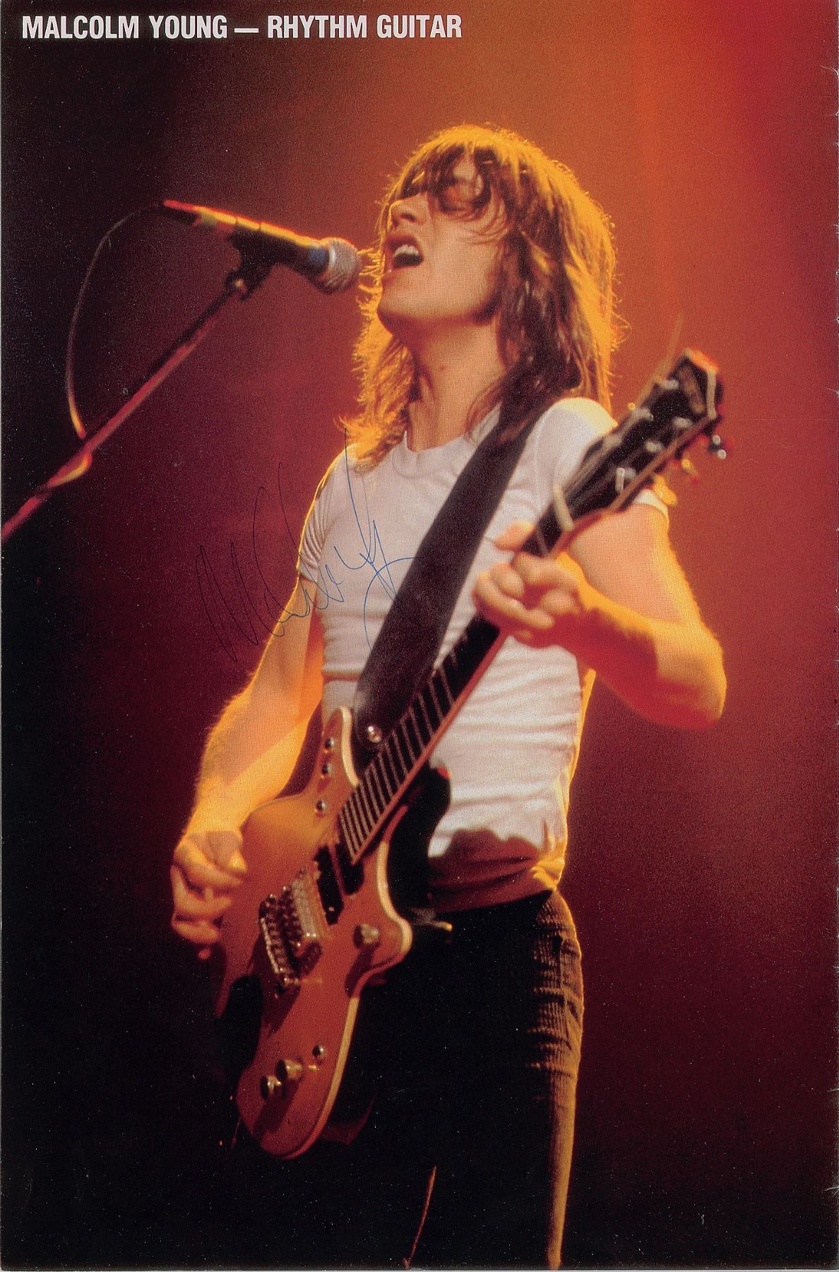 Uncommon original program for AC/DC’s Back in Black World Tour of 1980, 16 pages, 9.25 x 14, signed and inscribed on their respective pages in blue ballpoint, “To Mrs. Usher, All the best, Angus Young, AC/DC,” “Malcolm Young,” “Cliff Williams, AC/DC,” “Phil Rudd, AC/DC,” and “Brian Johnson, AC/DC.” In very good to fine condition, with general handling wear.