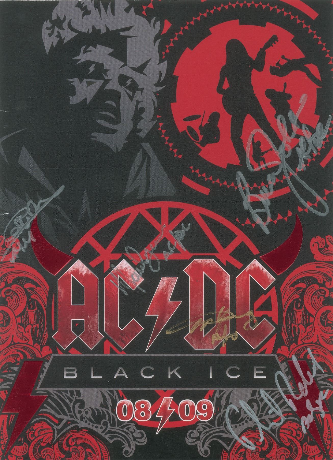 Original program for the 2009 European leg of AC/DC's Black Ice World Tour, 28 pages, 9.5 x 13, signed on the front cover in gold ink by Angus Young, and in silver ink by Brian Johnson, Cliff Williams, Phil Rudd, and Malcolm Young, with each adding "AC/DC." In fine condition. The consignor notes that the autographs were obtained by a roadie on the tour. Accompanied by a certificate of authenticity from Tracks.