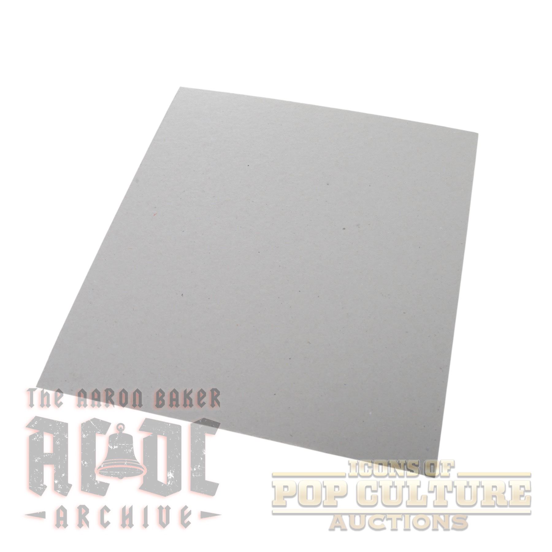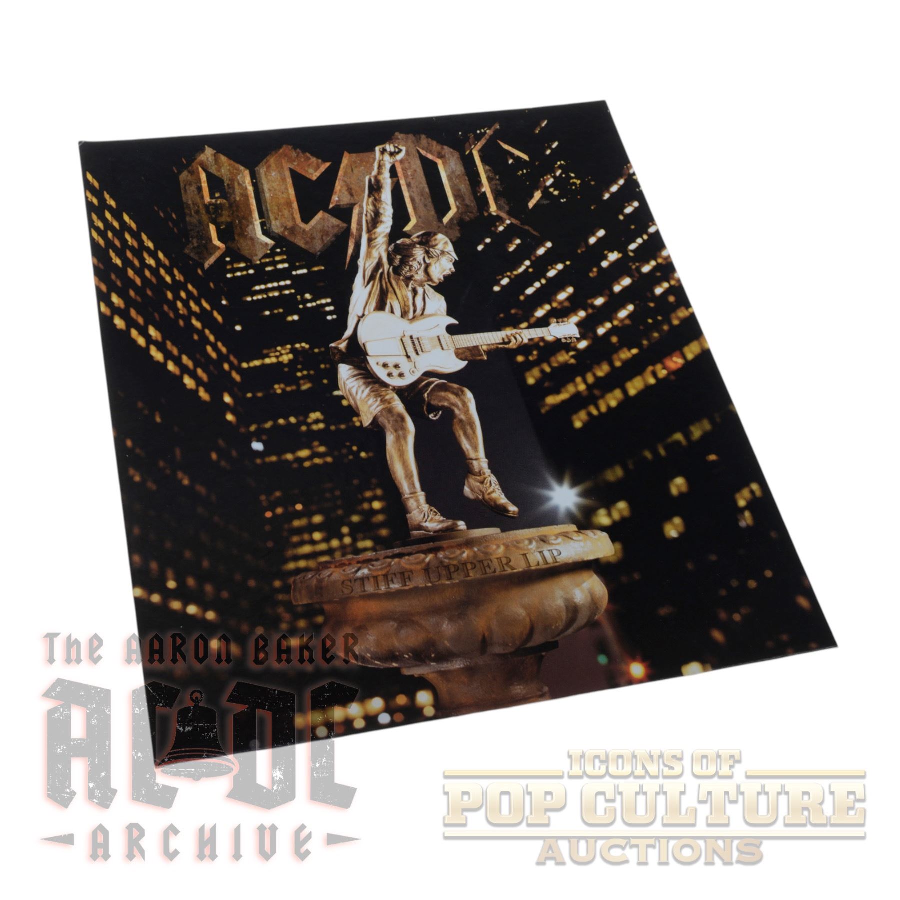 This is an original AC/DC store display featuring the iconic artwork from the Stiff Upper Lip album. Measuring approximately 11.75" x 10.25", this piece is printed on thick cardboard with a glossy finish. The display prominently showcases the Angus Young statue against a backdrop of city skyscrapers, with the band’s logo boldly emblazoned at the top. The reverse side is plain cardboard, emphasizing its use as a countertop or wall display. This vibrant and rare promotional item was designed to attract attention in record stores during the release of the album.