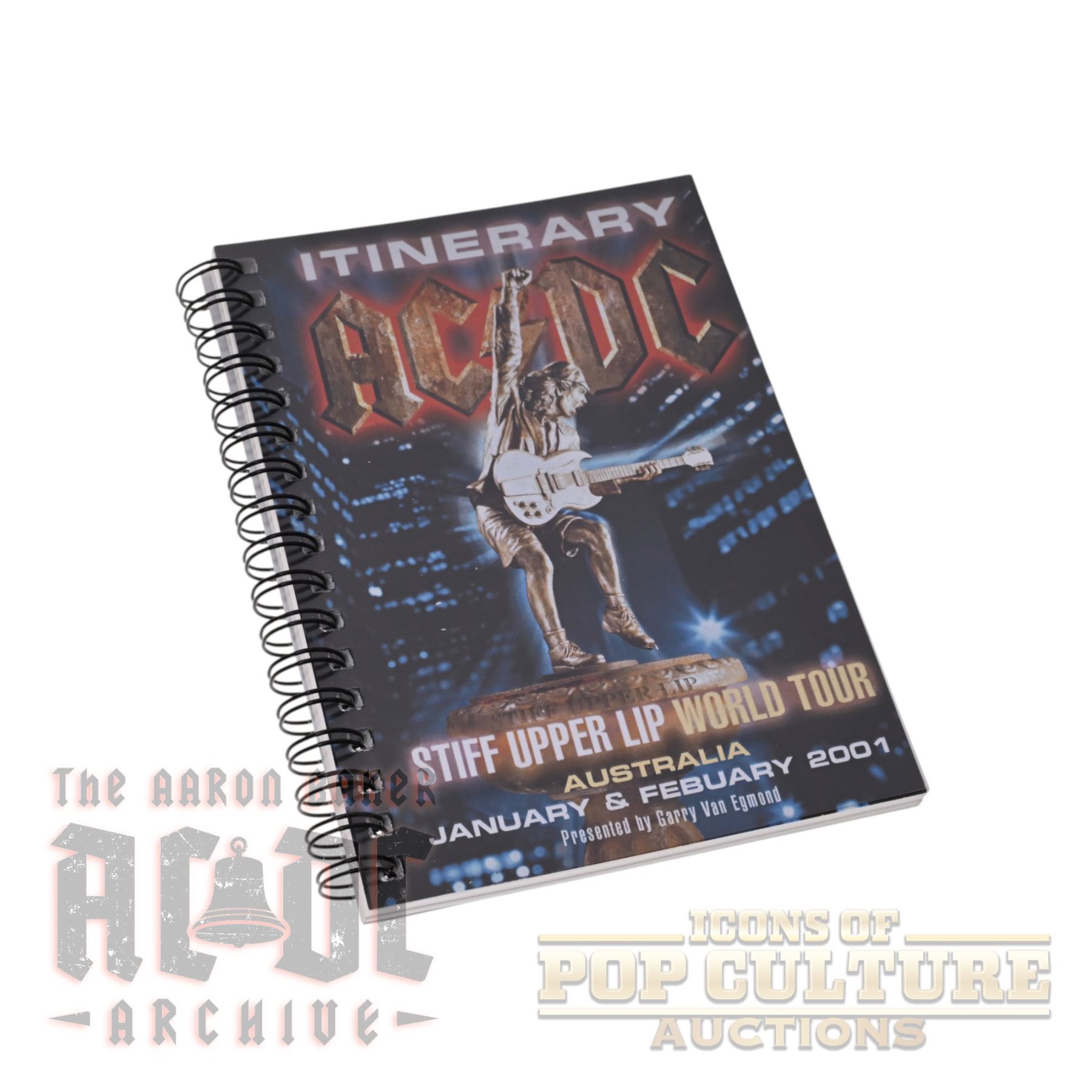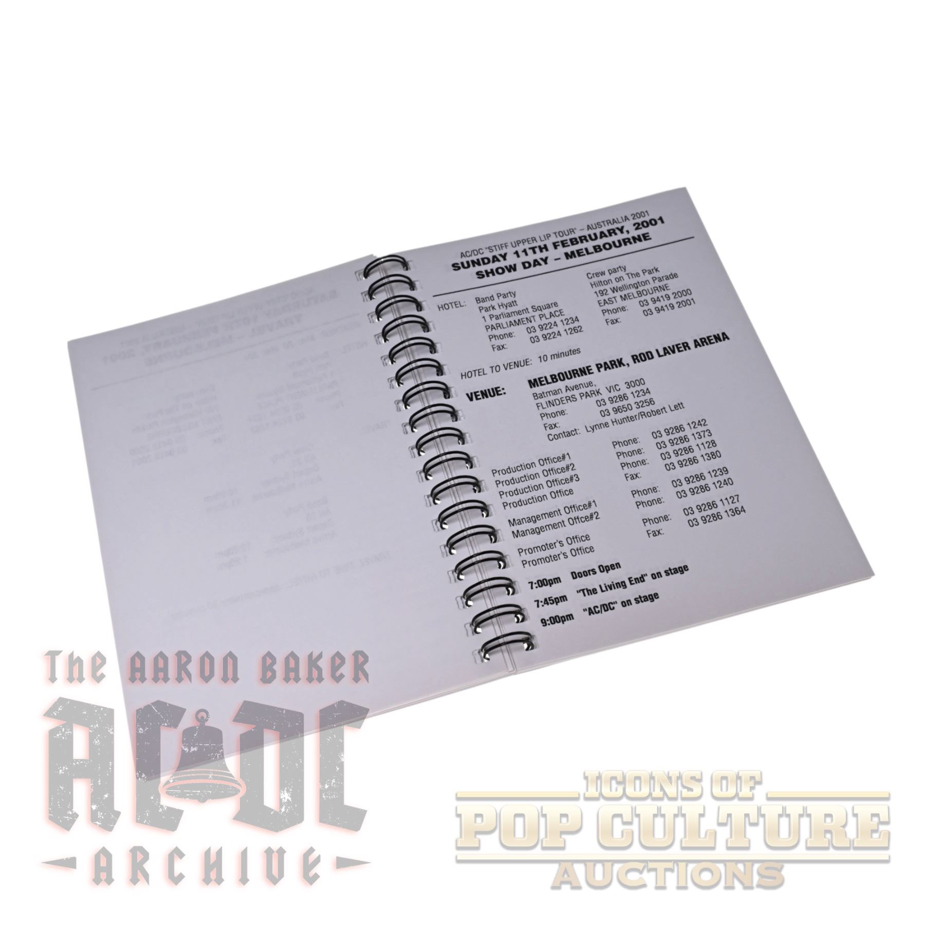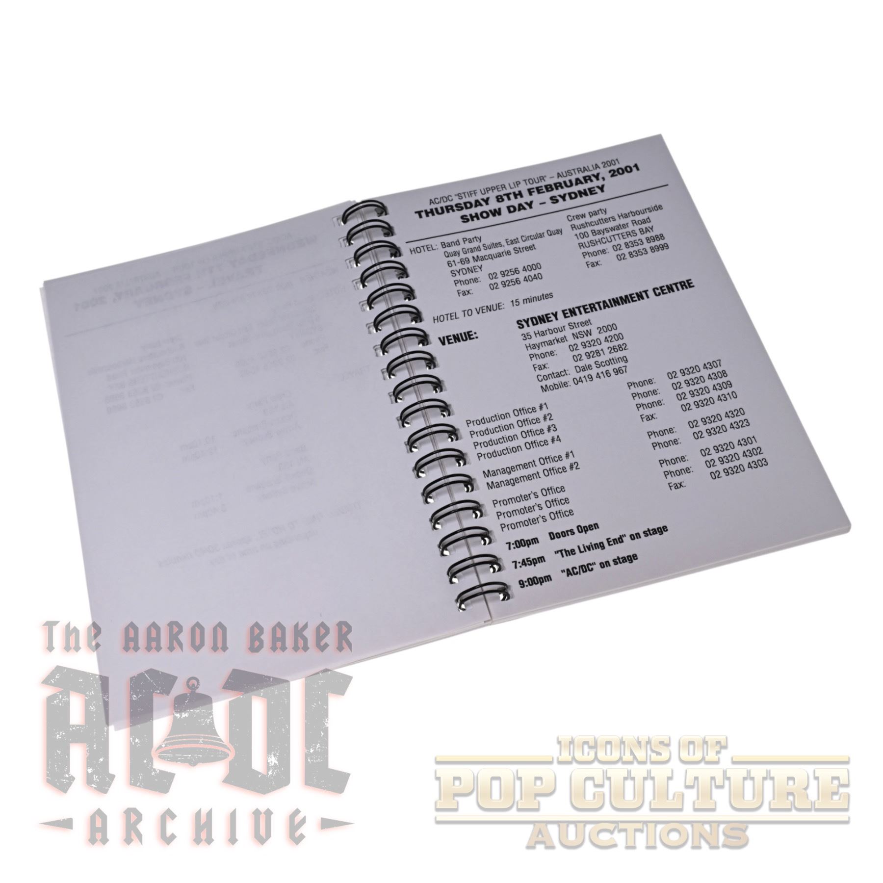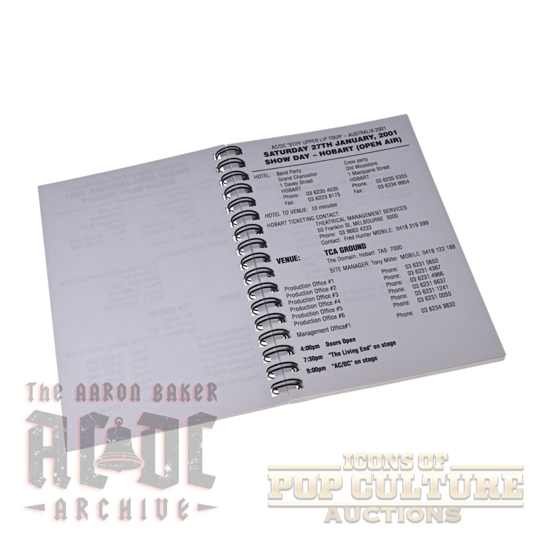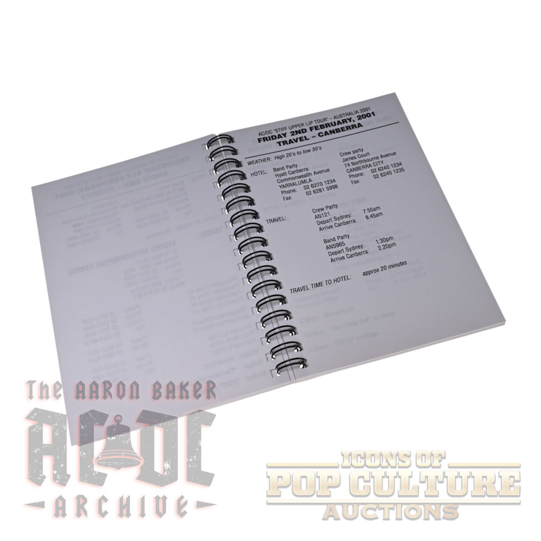 Presented here is an original tour itinerary book from AC/DC’s Stiff Upper Lip World Tour, covering the Australia leg in January and February 2001. Issued exclusively to band members, crew, and tour staff, these spiral-bound itineraries contained critical day-to-day details including hotel arrangements, travel logistics, venue contacts, production schedules, and performance times. The itinerary outlines key dates across major Australian cities, including Hobart, Canberra, Sydney, and Melbourne, with set times for supporting act The Living End and AC/DC’s headlining performances. Produced in extremely limited numbers for internal use only, itinerary books such as this one offer a rare behind-the-scenes look at the organization and operations of a major international rock tour. This piece provides unique insight into AC/DC’s 2001 tour and stands as an exceptional collectible for fans and memorabilia enthusiasts.