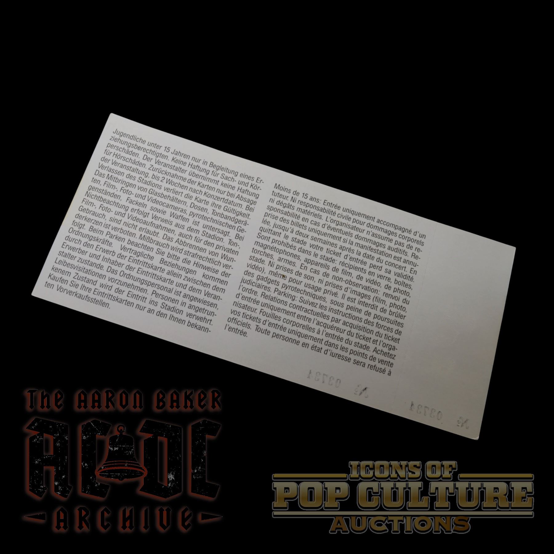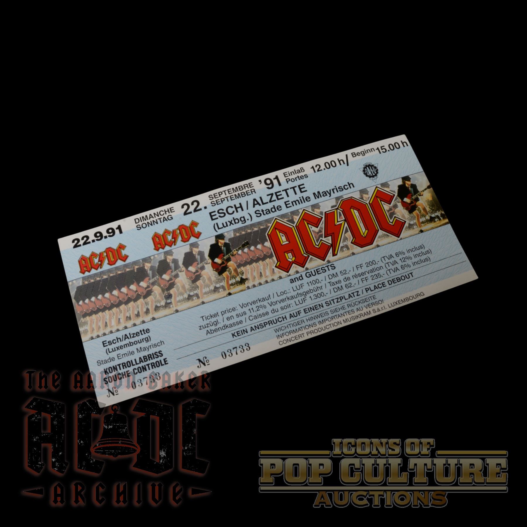 An original 8" x 3.75" ticket stub from AC/DC’s electrifying performance on September 22, 1991, at Stade Émile Mayrisch in Esch-sur-Alzette, Luxembourg. This vibrant full-color ticket features a dynamic graphic lineup of Angus Young in motion, set beneath the band’s bold red logo. Held during the “The Razor’s Edge” World Tour, this show was one of the final European dates of the year, capturing the band at the peak of their ‘90s resurgence. The reverse of the ticket includes terms printed in German and French, with the band's name embossed along the bottom edge. A rare and visually striking artifact from a powerhouse era of AC/DC’s global dominance.