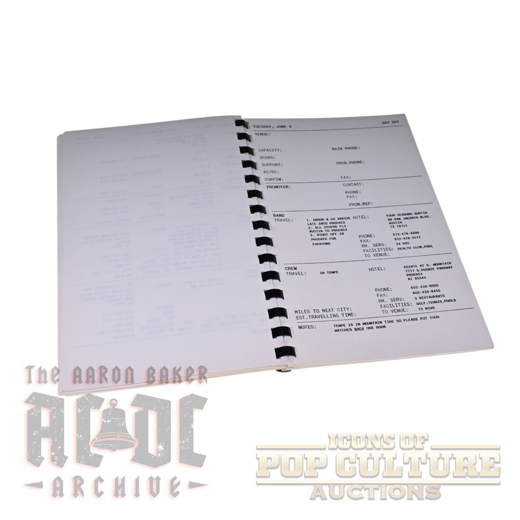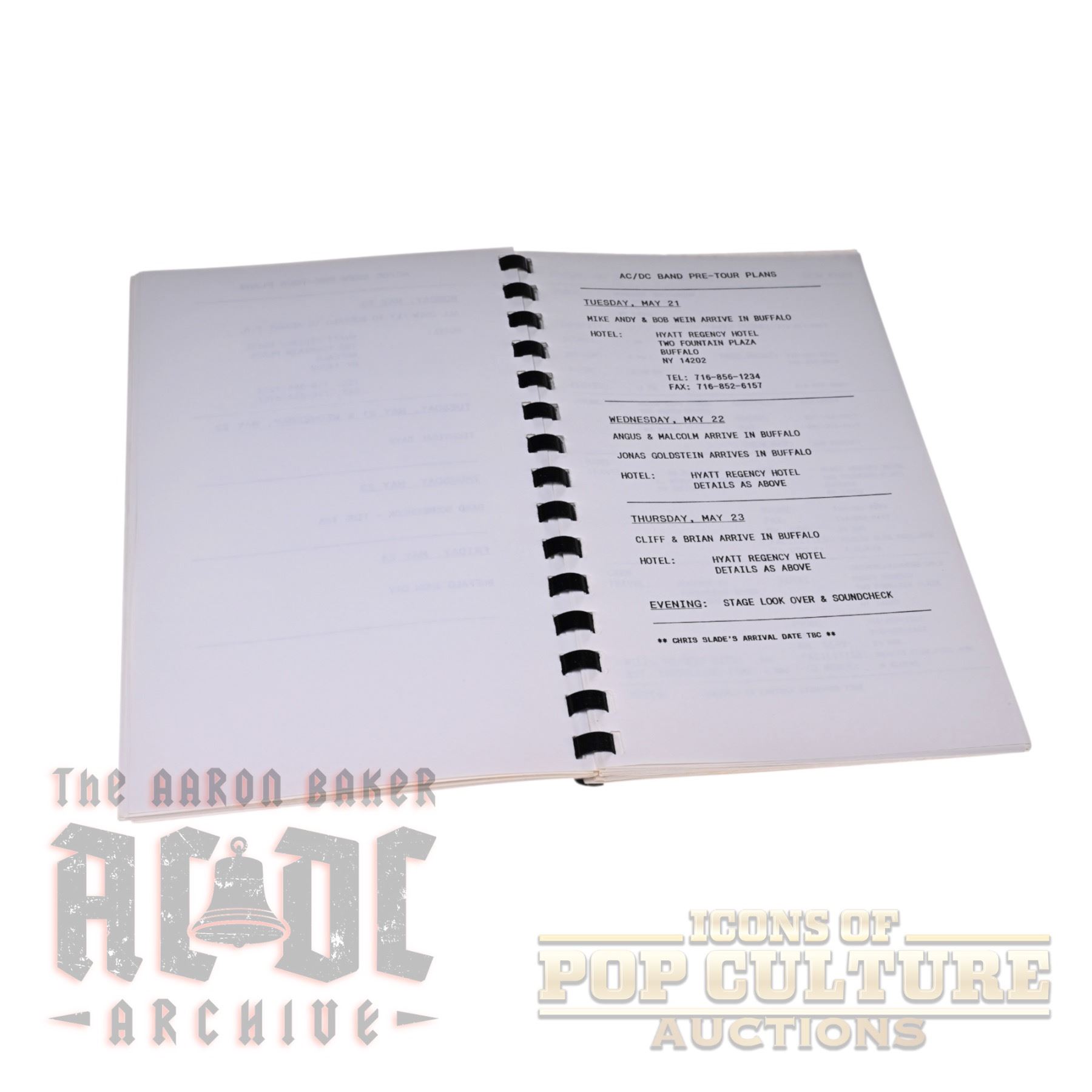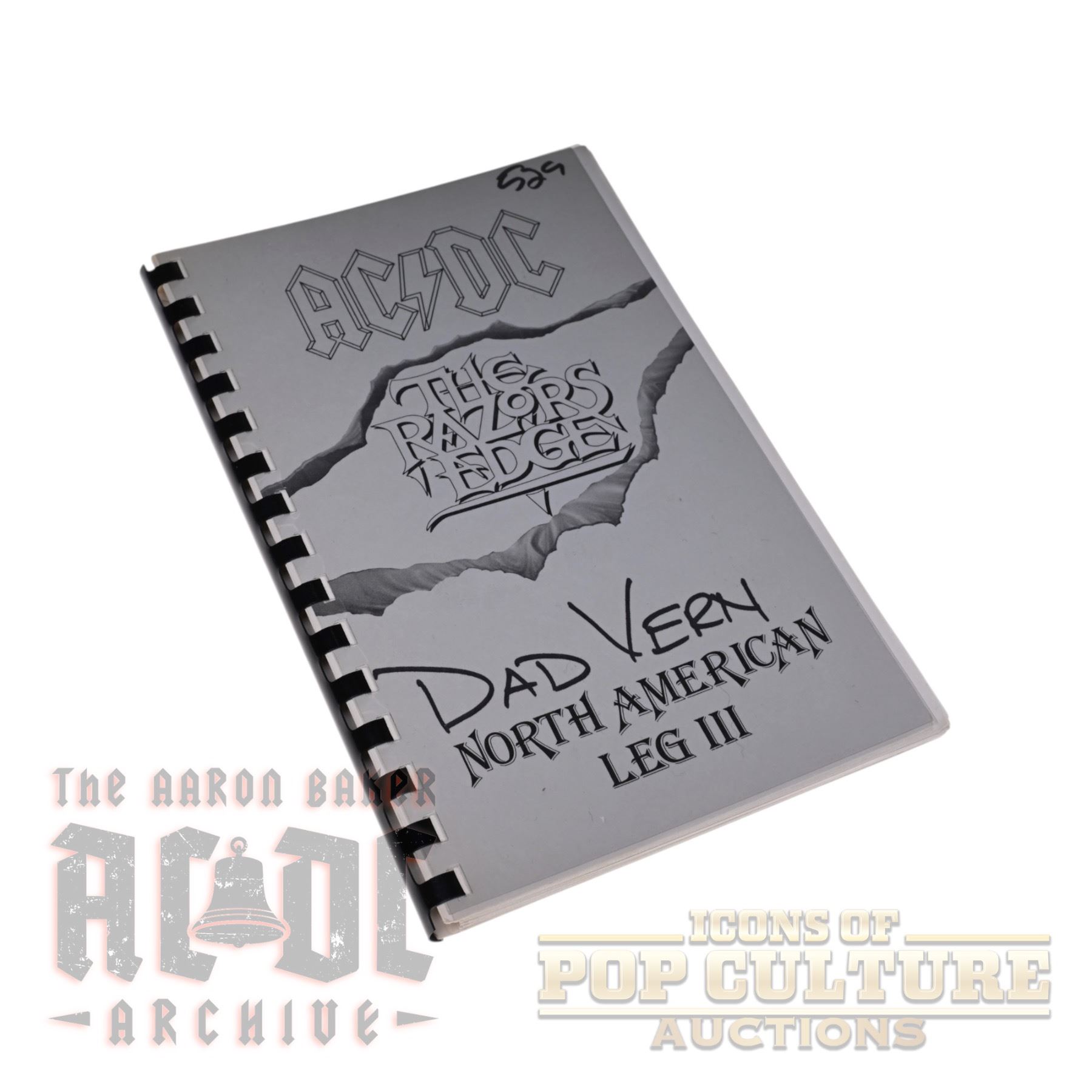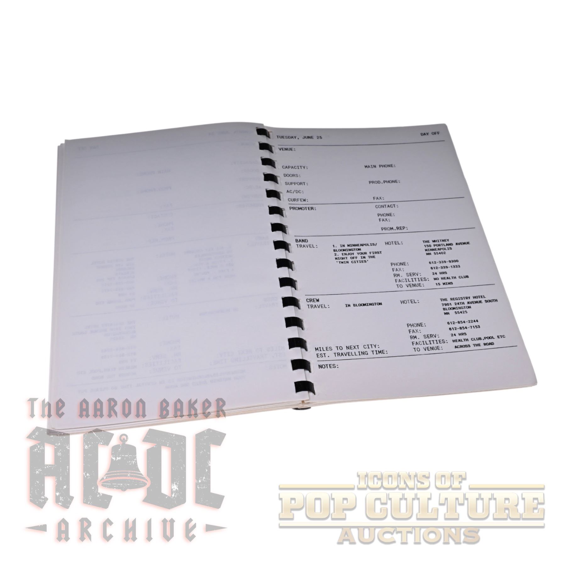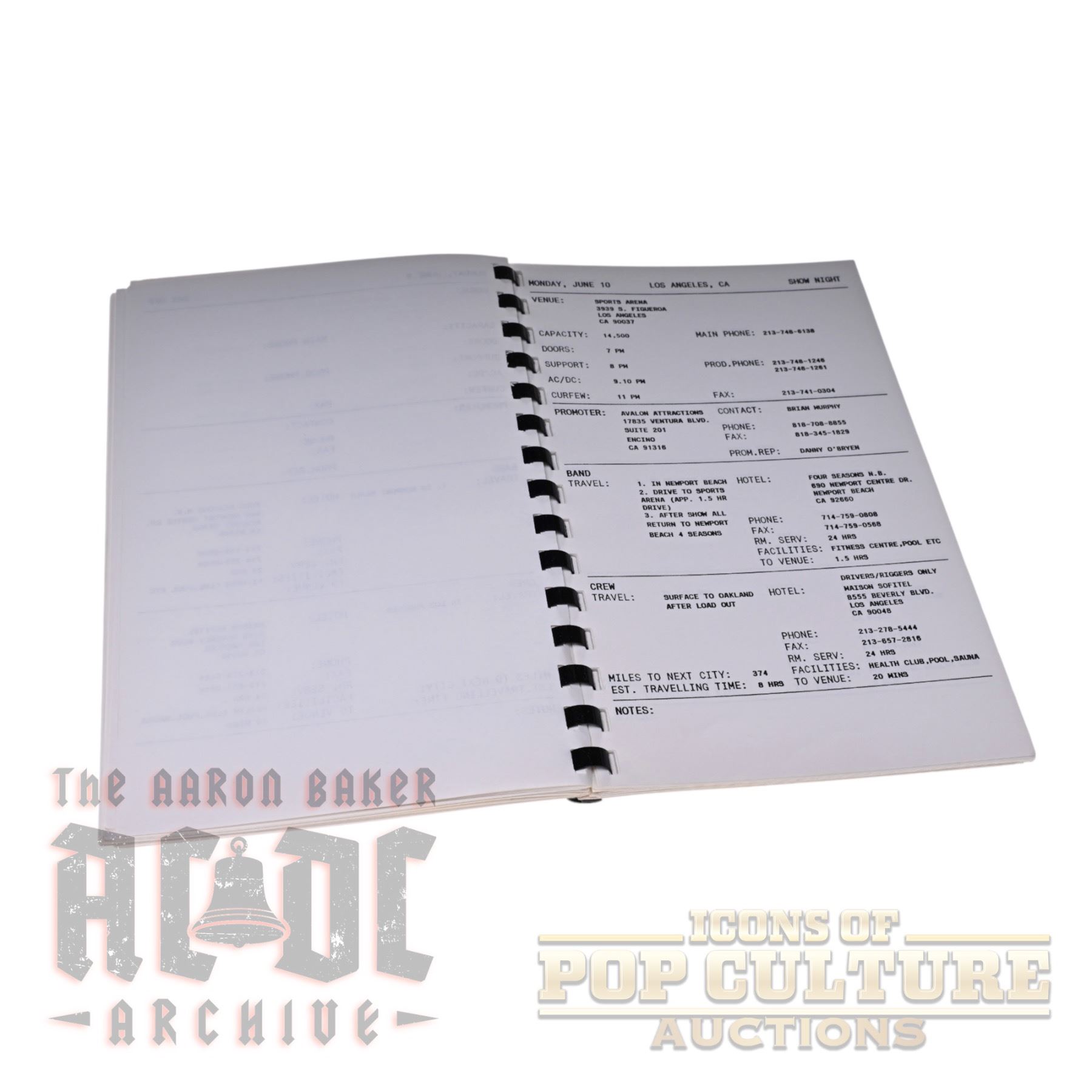 This is an original tour itinerary book from AC/DC’s The Razors Edge North American Tour, Leg III. The comb-bound booklet contains detailed schedules, hotel arrangements, venue information, promoter and crew contacts, and travel logistics for the band and staff. Covering multiple dates, it offers a rare behind-the-scenes look at the planning and execution of a major rock tour during the early 1990s. These itineraries were created for internal use by band members and crew, making them highly collectible artifacts of AC/DC’s touring history.