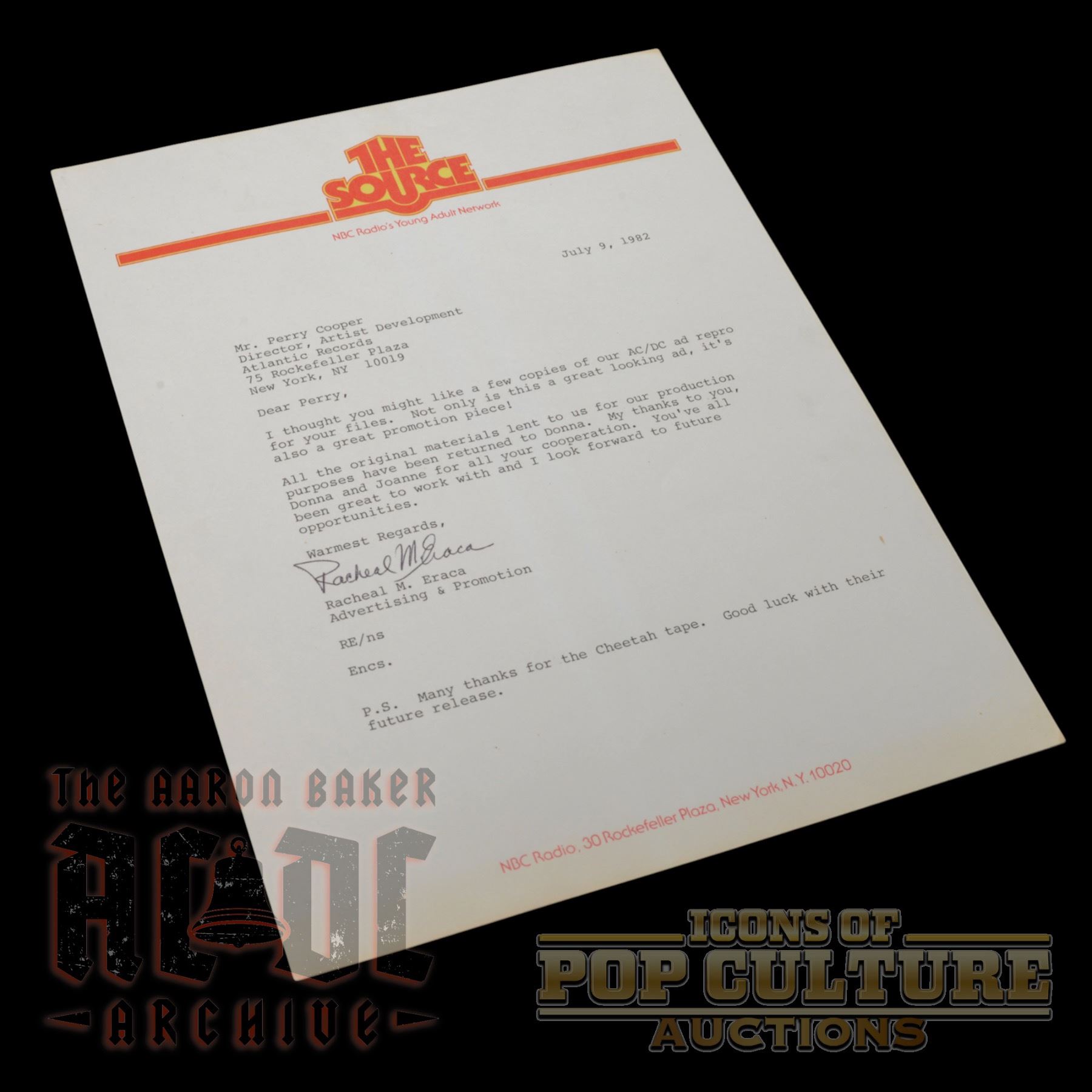 A fascinating glimpse into early ‘80s AC/DC promotion, this set includes an original July 9, 1982 letter on “The Source” letterhead, NBC Radio’s Young Adult Network, sent from Racheal M. Eraca (Advertising & Promotion) to Perry Cooper, Director of Artist Development at Atlantic Records.