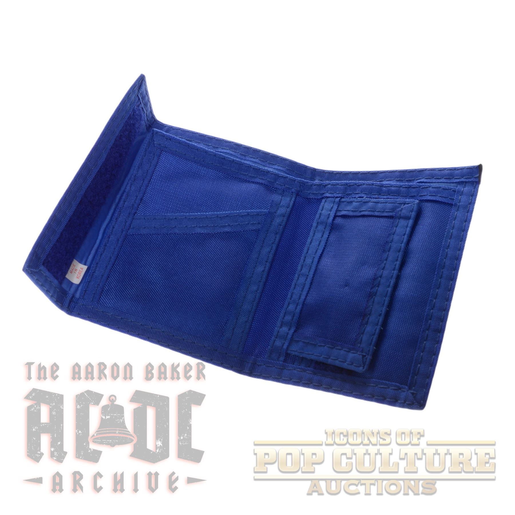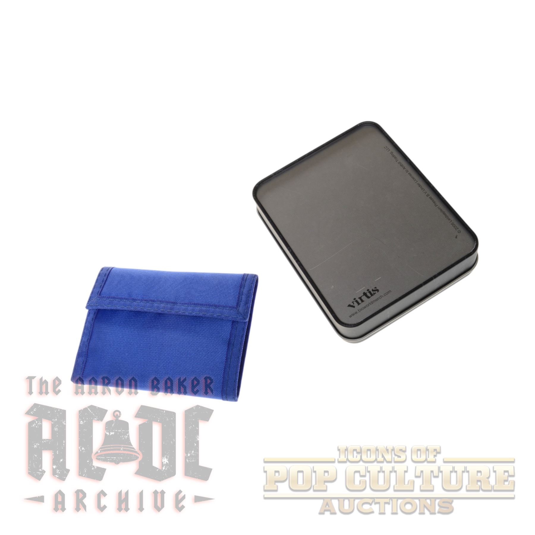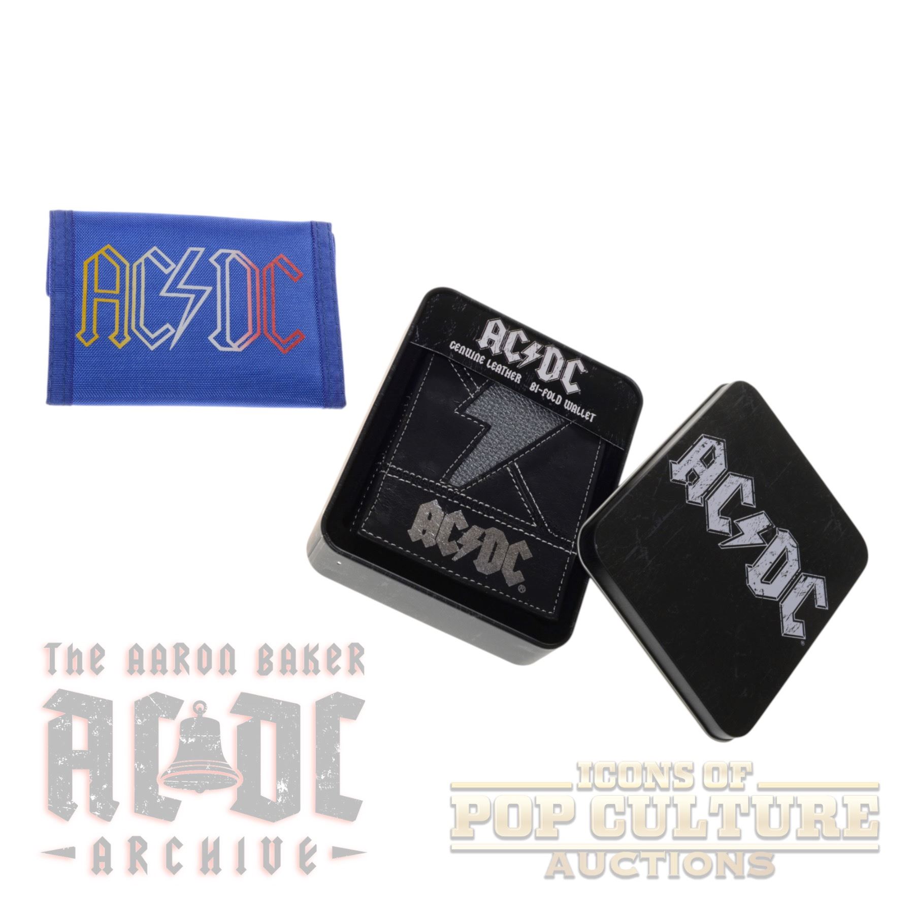 A rockin’ duo of AC/DC-themed wallets, perfect for any die-hard fan. The first is a vibrant blue fabric wallet featuring the iconic AC/DC logo in bold red, yellow, and white, complete with multiple compartments and a Velcro closure. The second is a genuine leather bi-fold wallet in black with a stitched lightning bolt design and AC/DC branding, presented brand new in its original black metal case measuring 5.25" x 4.25" x 1.25". Whether carried daily or kept as collectible memorabilia, these wallets showcase the unmistakable style of one of rock’s greatest bands.