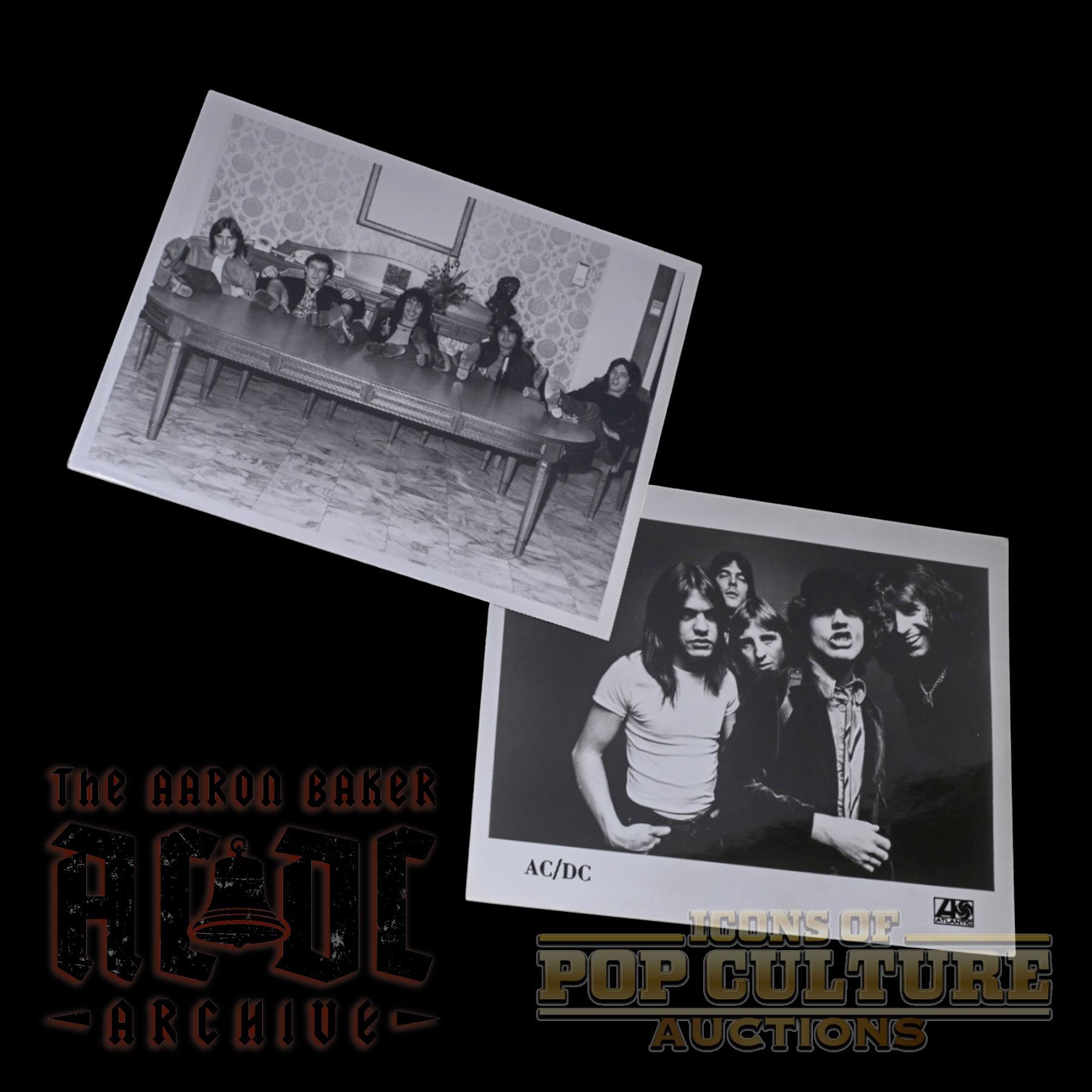 This set includes two 8" x 10" AC/DC photographs. The first features Angus Young, Malcolm Young, Bon Scott, Cliff Williams, and Phil Rudd seated around a table with their feet propped up, capturing the band’s rebellious spirit and camaraderie. The second is the iconic image used on the cover of the 1979 album Highway to Hell, one of AC/DC’s most legendary releases and Bon Scott’s final album with the band. Together, these photographs highlight both the band’s playful off-stage character and one of their most enduring rock ‘n’ roll images.