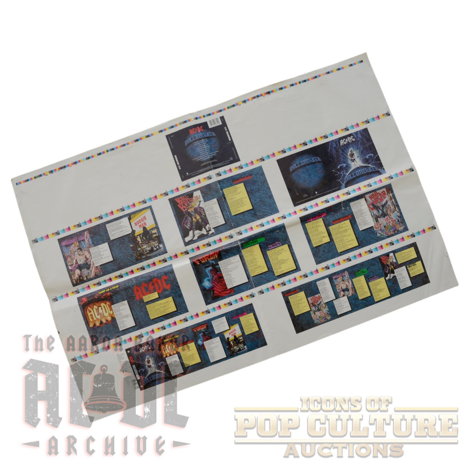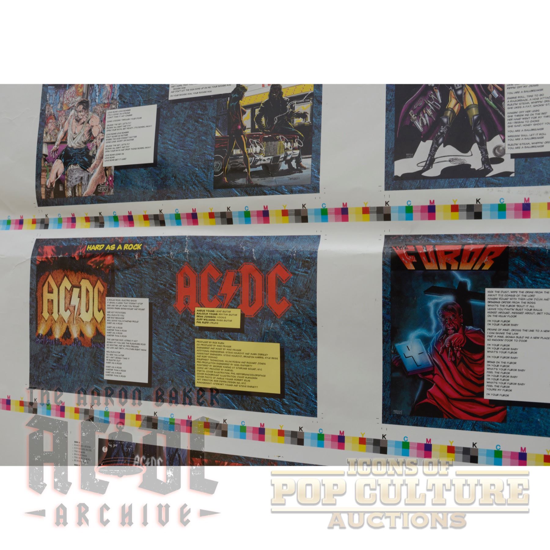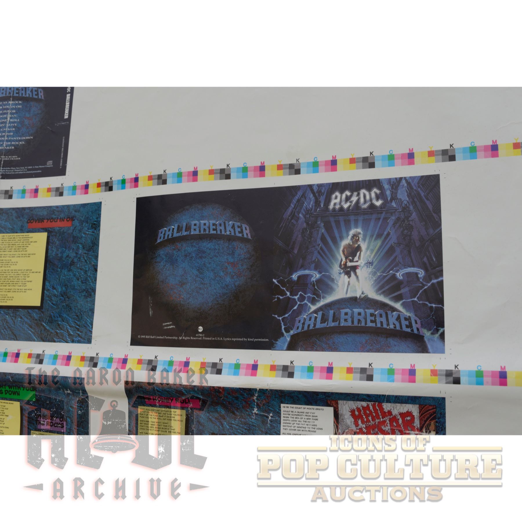 Offered here is a very rare uncut printer’s proof for AC/DC’s 1995 album BallBreaker. Measuring approximately 38" x 25", the sheet features the complete CD packaging layout including the front cover, back cover, and inner booklet pages, along with color bars and print alignment guides along the edges. The proof showcases the iconic BallBreaker cover art featuring Angus Young, as well as printed lyrics and album credits. Printer’s proofs like this were created in extremely limited numbers for review and approval prior to final production, making this a scarce piece of production ephemera tied to one of AC/DC’s major 1990s releases.