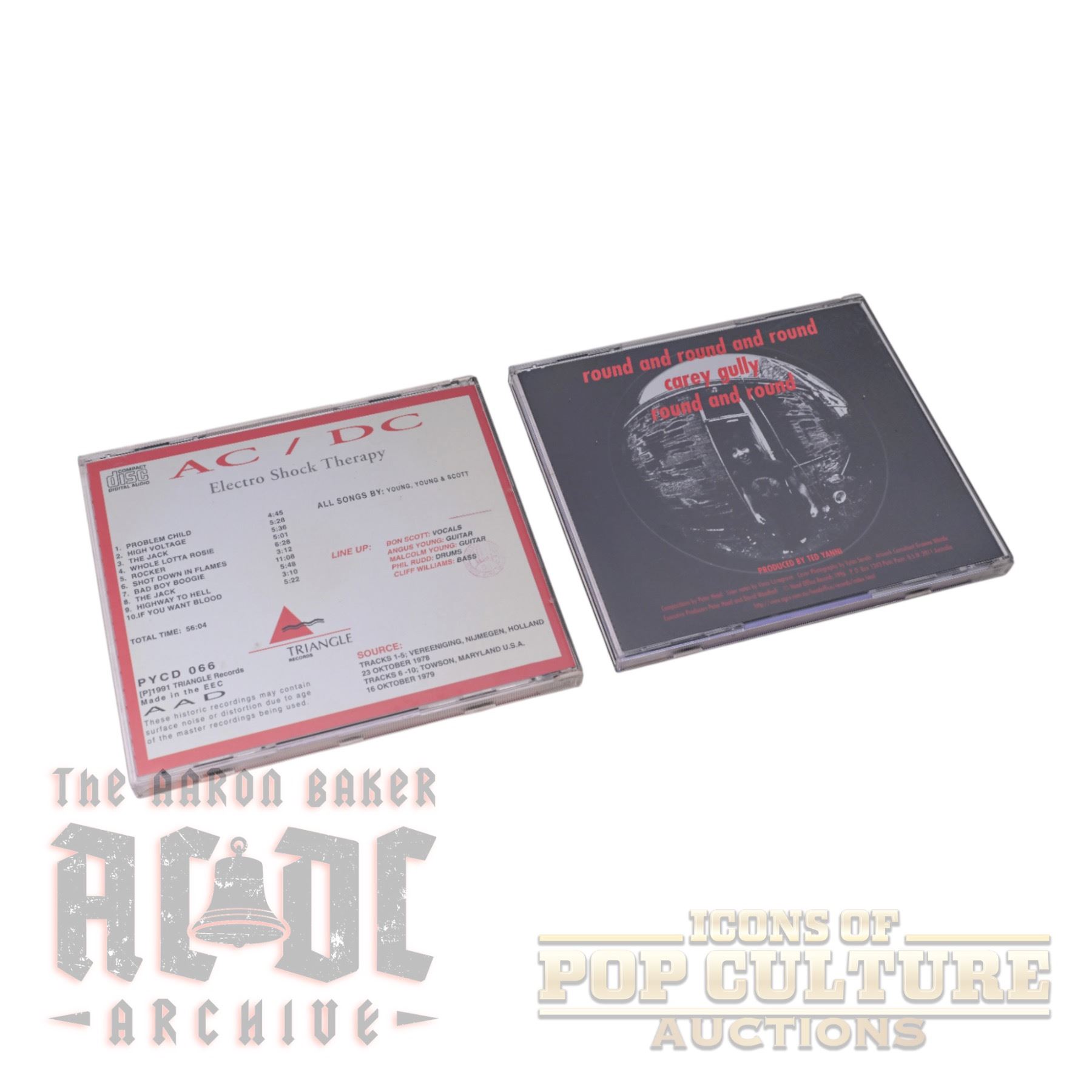 This lot includes two unofficial AC/DC compact discs. The first is Electro Shock Therapy, featuring a live recording from Holland in 1979 during the Bon Scott era, with performances of classics such as Problem Child, High Voltage, Sin City, Bad Boy Boogie, and If You Want Blood (You’ve Got It). The second disc is Bon Scott’s Round and Round and Round, which compiles early pre-AC/DC recordings including Round and Round and Round and Carey Gully. Together, these discs showcase both rare live material from AC/DC’s early years and a glimpse into Bon Scott’s musical history before joining the band.
