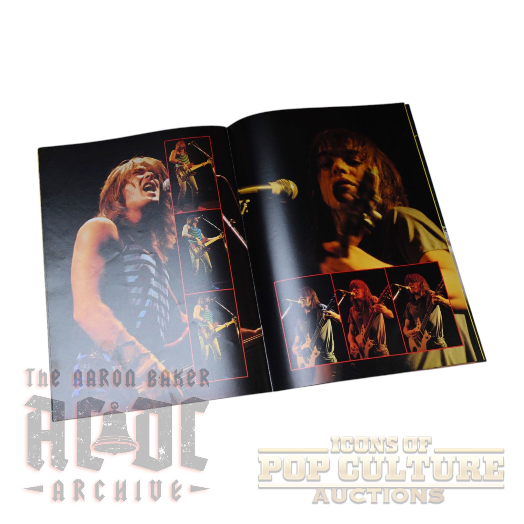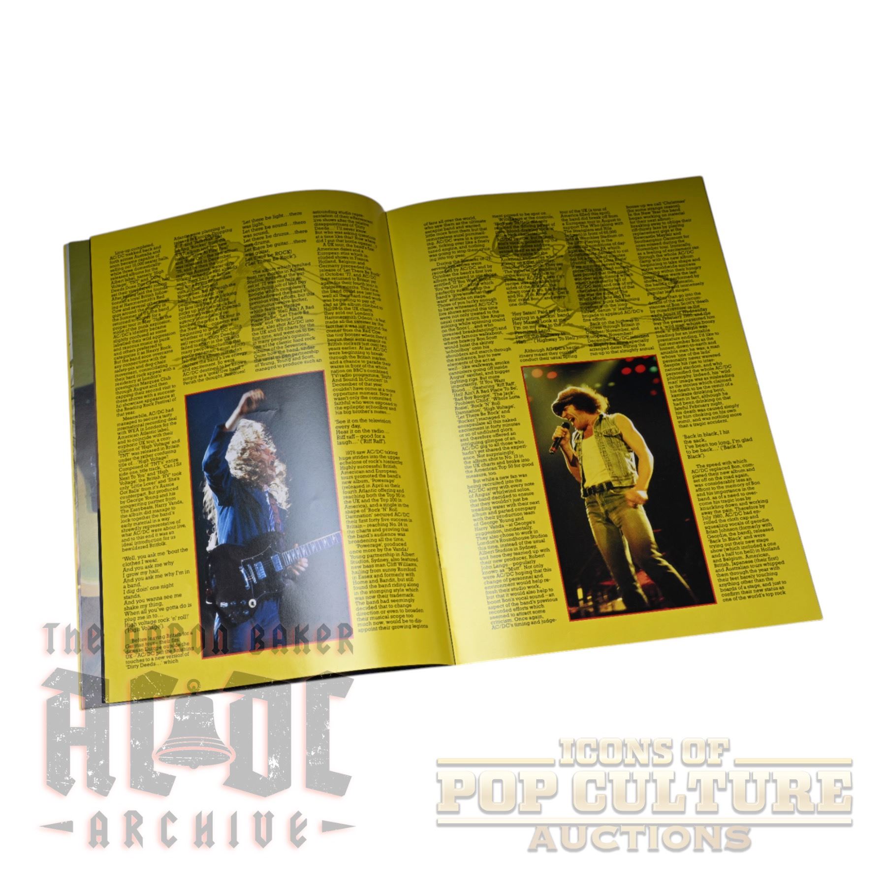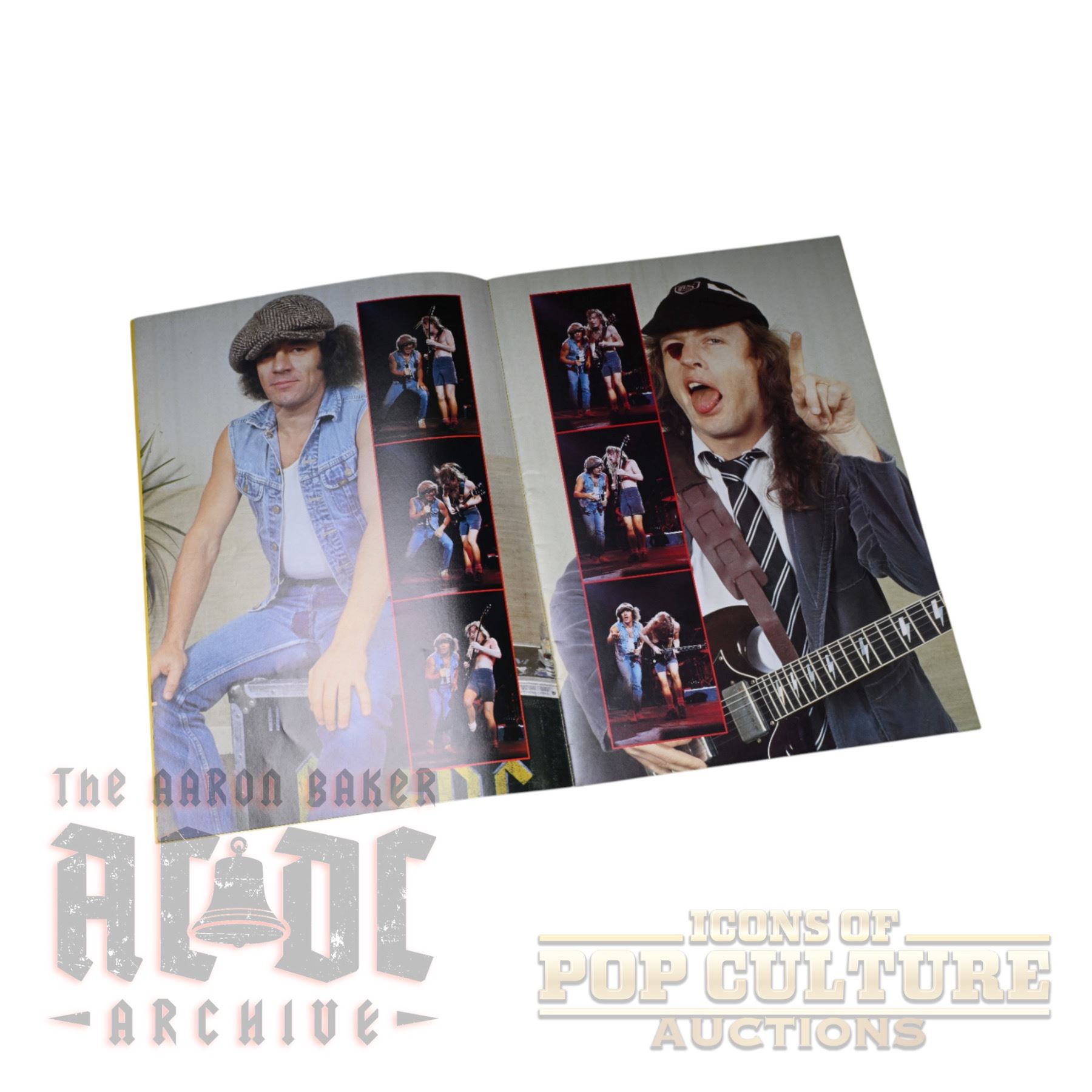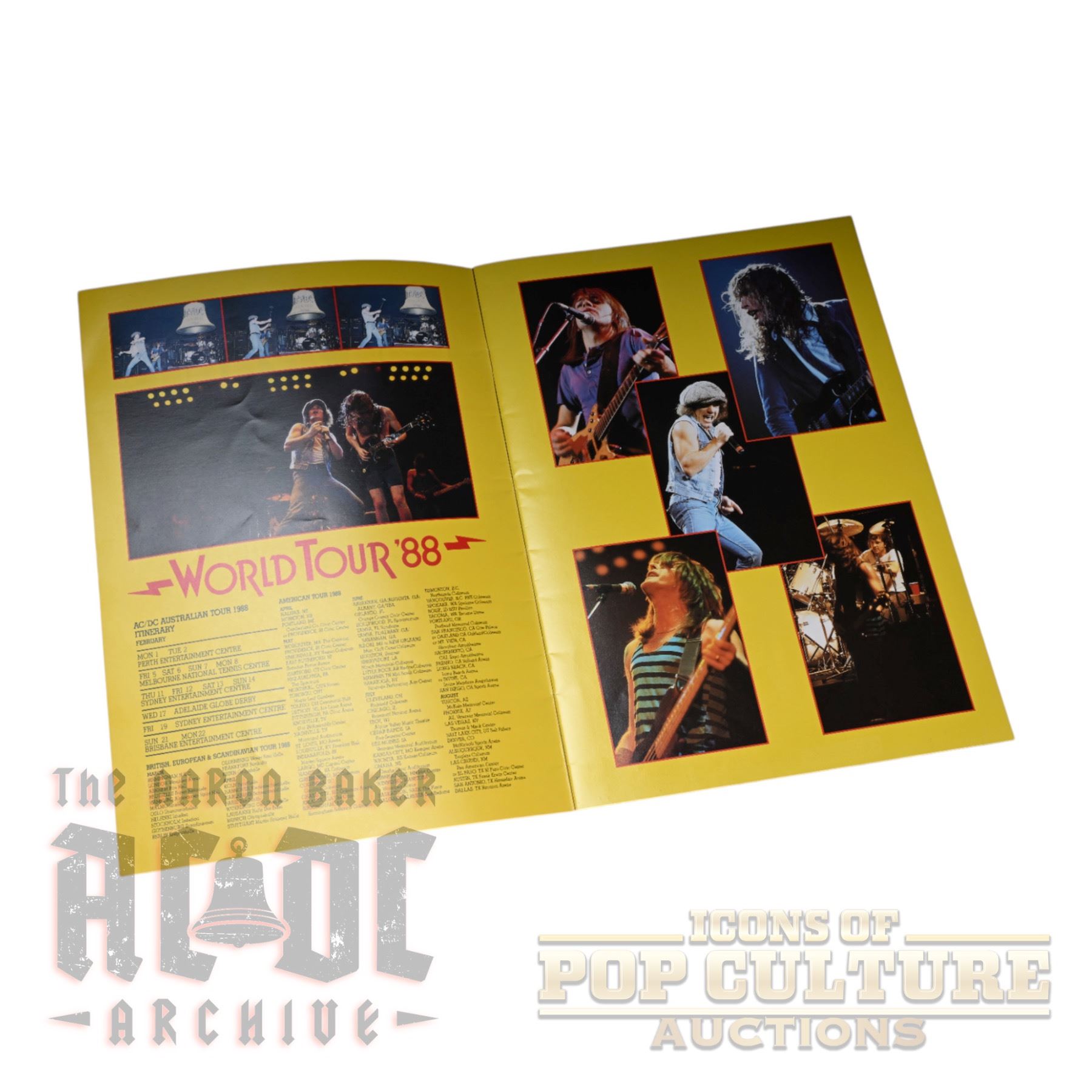 Offered here is an original AC/DC World Tour ’88 tour book, measuring approximately 13" x 9.25". Produced for the Australian leg of the 1988 tour, this program is filled with vibrant full-color photography of the band on stage and behind the scenes, along with individual features on Angus Young, Malcolm Young, Brian Johnson, Cliff Williams, and Simon Wright. The book also includes tour dates, concert imagery, and dynamic spreads capturing the energy of AC/DC during their Blow Up Your Video era. A classic collectible from the band’s powerhouse late-1980s touring years.