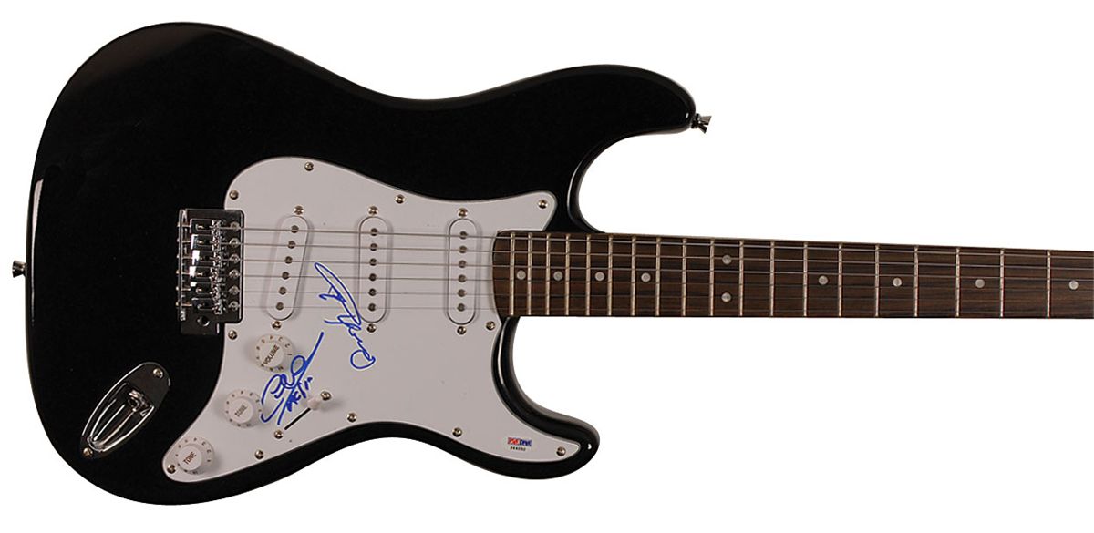 Black-bodied Stedman Pro ‘stratocaster-style’ electric guitar, signed on the white pickguard in blue felt tip by Angus Young and Cliff Williams, who adds the band’s name. In fine condition, with a light brush to Williams’s signature and a PSA/DNA authentication label affixed to pickguard. Accompanied by a certificate of authenticity from PSA/DNA and two photos taken at time of signing. Oversized.