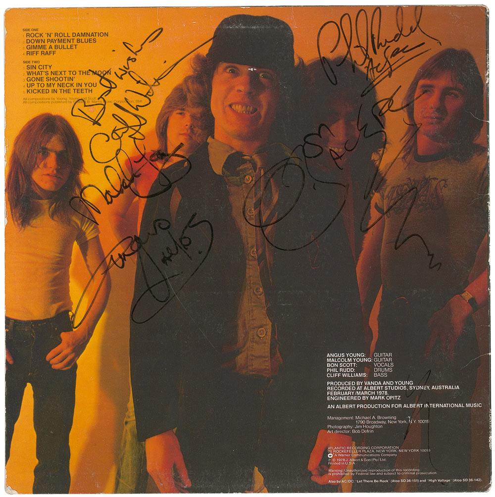 Powerage album signed on the back cover in black felt tip “Bon AC/DC,” “Angus AC/DC,” “Malcolm Young,” “Best wishes, Cliff Williams,” and “Phil Rudd AC/DC.” Some light contrast to Scott’s signature, light ‘ring of wear’ to back cover, scattered edge creases, stray ink mark to bottom right, and a partial separation along bottom edge, otherwise fine condition. The record is included. Scott’s 1980 bizarre death has made any item signed by the group’s original line-up a must-have for AC/DC fanatics.