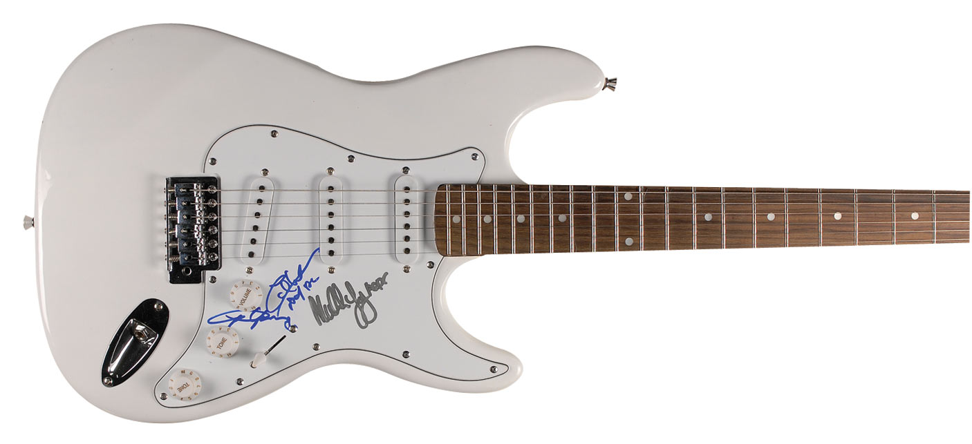 White-bodied Stedman Pro ‘stratocaster-style’ electric guitar signed on the white pickguard in blue felt tip by Cliff Williams and Angus Young and in silver ink by Malcolm Young. In fine condition. Oversized.