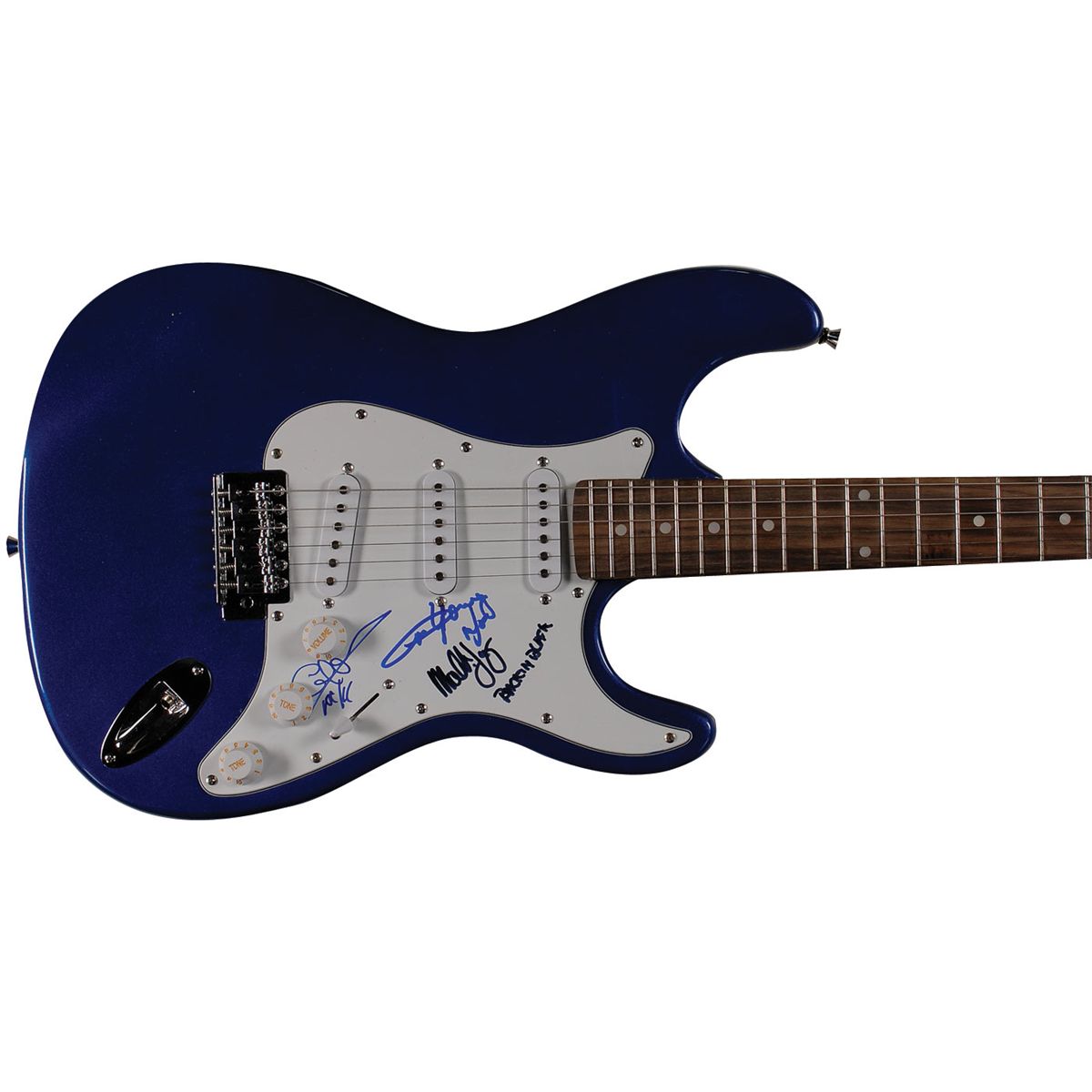 Blue-bodied Crescent ‘stratocaster-style’ electric guitar, signed on the white pickguard in blue felt tip by Angus Young and Cliff Williams, and in black felt tip by Malcolm Young, adding “Back in Black.” In fine condition. Oversized.