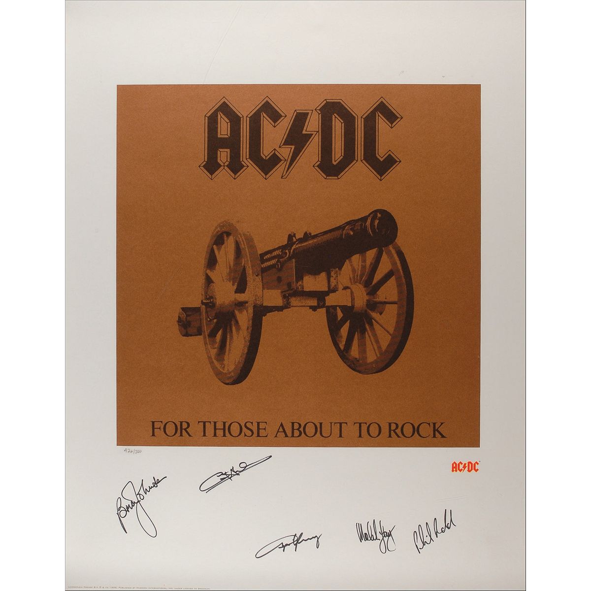 Color limited edition 22 x 28 lithograph of the artwork for ‘For Those About To Rock,’ numbered #422/500, signed in the lower border in black felt tip by Brian Johnson, Angus Young, Malcolm Young, Phil Rudd, and Cliff Williams. Rolled and in fine condition.