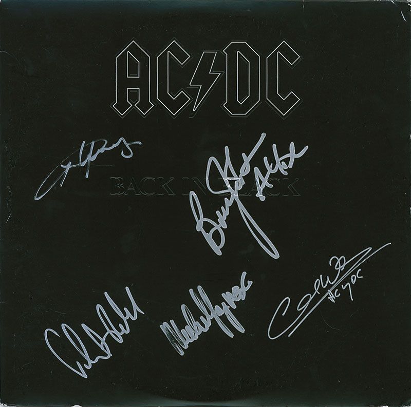 Back in Black reissue album signed on the front cover in silver ink by Brian Johnson, Angus Young, Malcolm Young, Phil Rudd, and Cliff Williams. In fine condition, with some slight edge wear and a light ‘ring of wear’ to cover. The record is included.