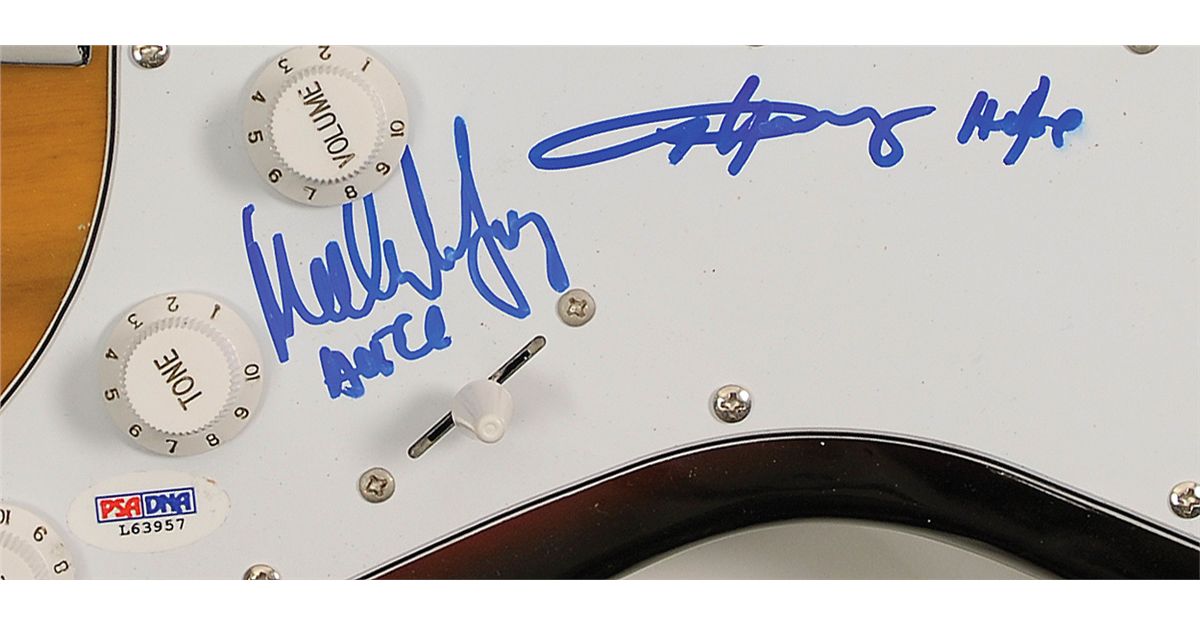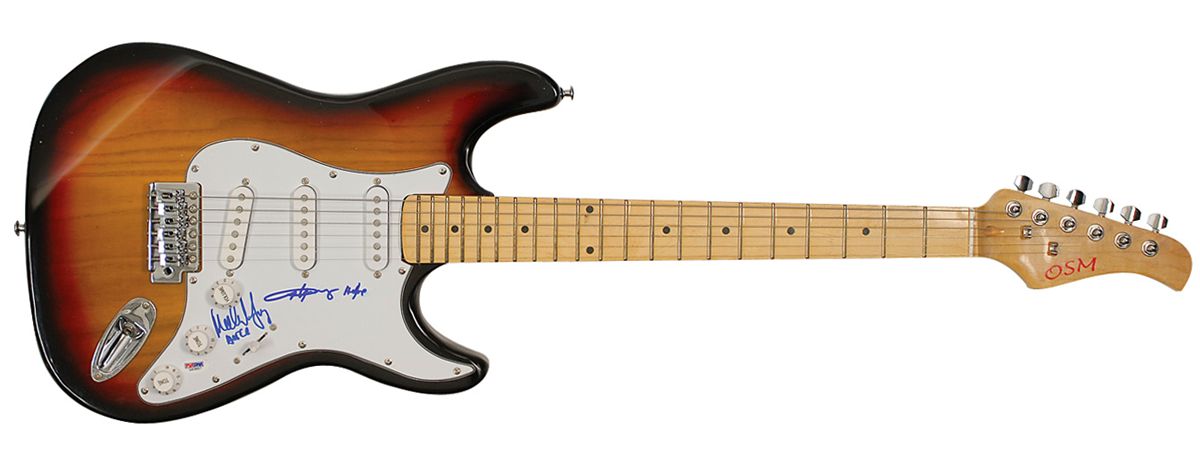 Sunburst-finish OSM ‘stratocaster-style’ electric guitar, signed on the white pickguard in blue felt tip by Angus Young and Malcolm Young, each adding the band’s name. In fine condition, with a PSA/DNA authentication label affixed to pickguard. Accompanied by a certificate of authenticity from PSA/DNA. Oversized.