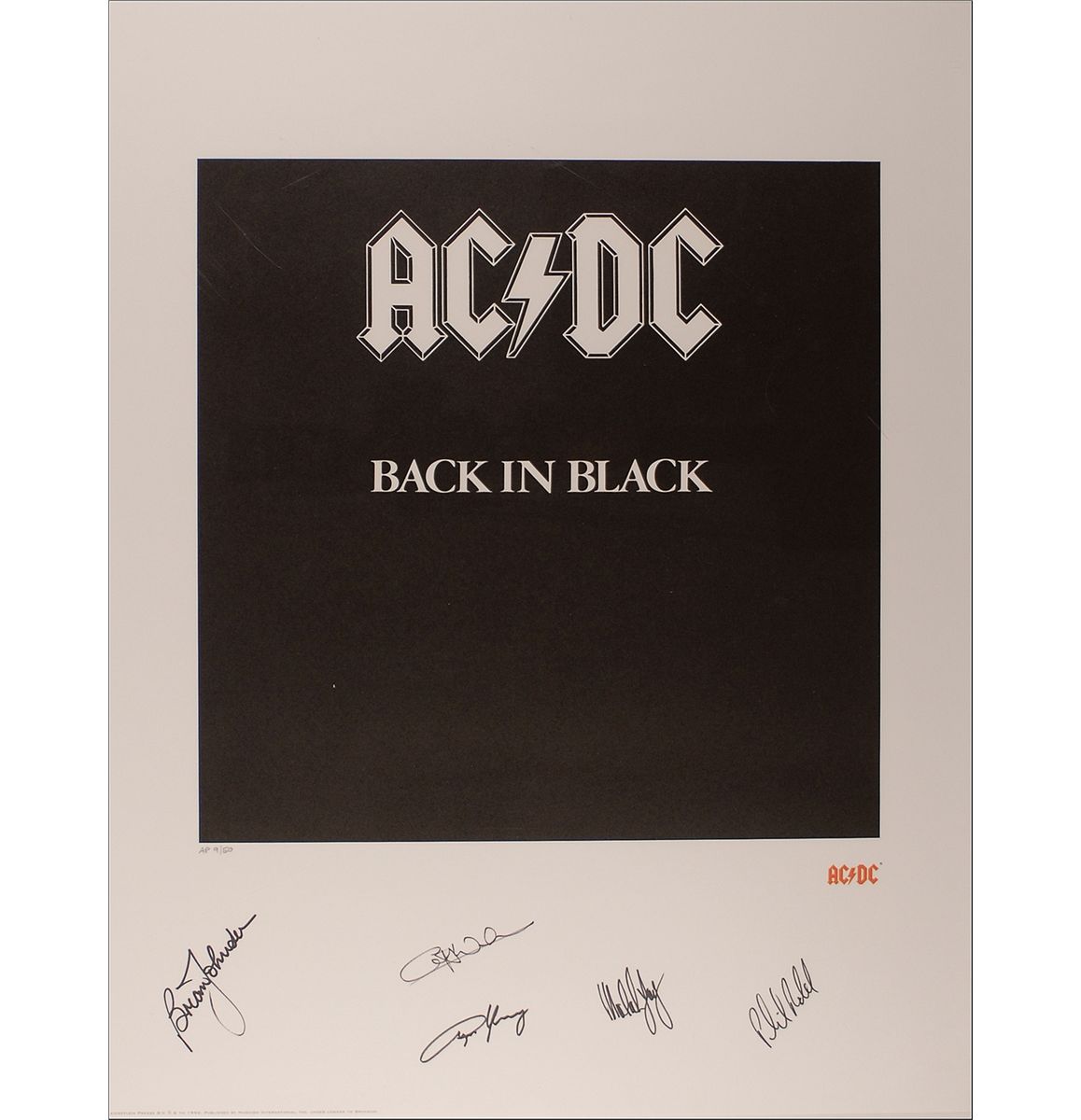 Color limited edition 22 x 28 lithograph of their Back In Black album cover, numbered #AP9/50, signed in the lower border in black felt tip by Brian Johnson, Angus Young, Malcolm Young, Phil Rudd, and Cliff Williams. Rolled and in fine condition, with a few scattered edge dings and creases. Accompanied by a composite photo of all five members taken at time of signing.