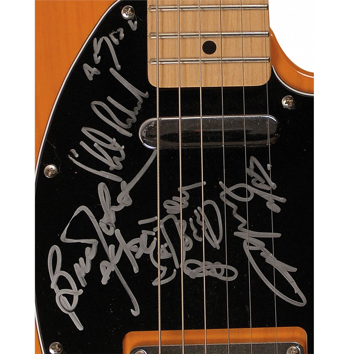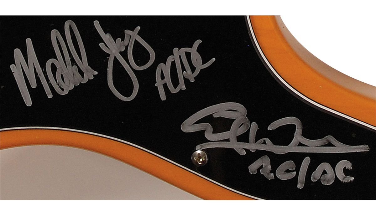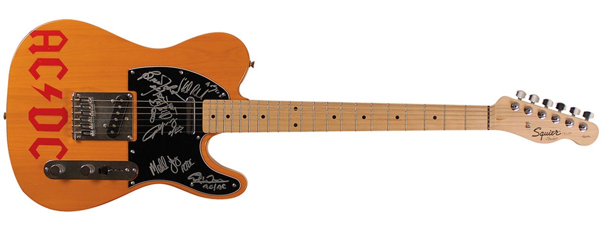Butterscotch-finish Fender Squier Tele ‘telecaster-style’ electric guitar, signed in silver ink on the black pickguard by Angus Young, Malcolm Young, Brian Johnson, Phil Rudd, and Cliff Williams, with all five adding the band’s name and Angus adding a quick self-portrait caricature. In fine condition. Oversized.