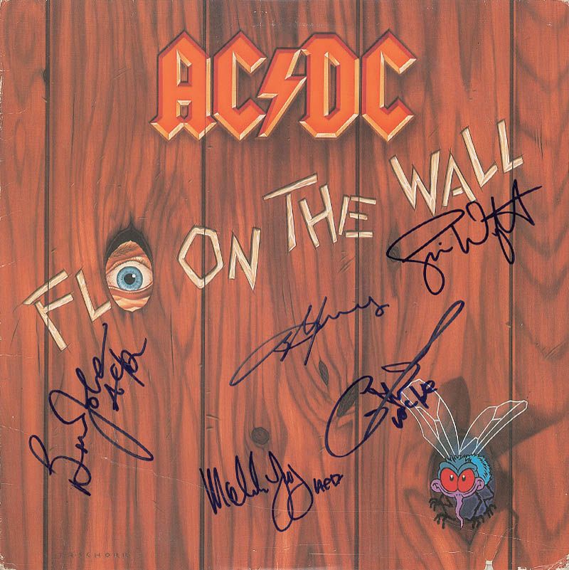 Fly on the Wall album signed on the front cover in blue felt tip by Brian Johnson, Angus Young, Malcolm Young, Cliff Williams, and Simon Wright. In fine condition, with a few light creases and a discount cut to the bottom edge. The record is included.