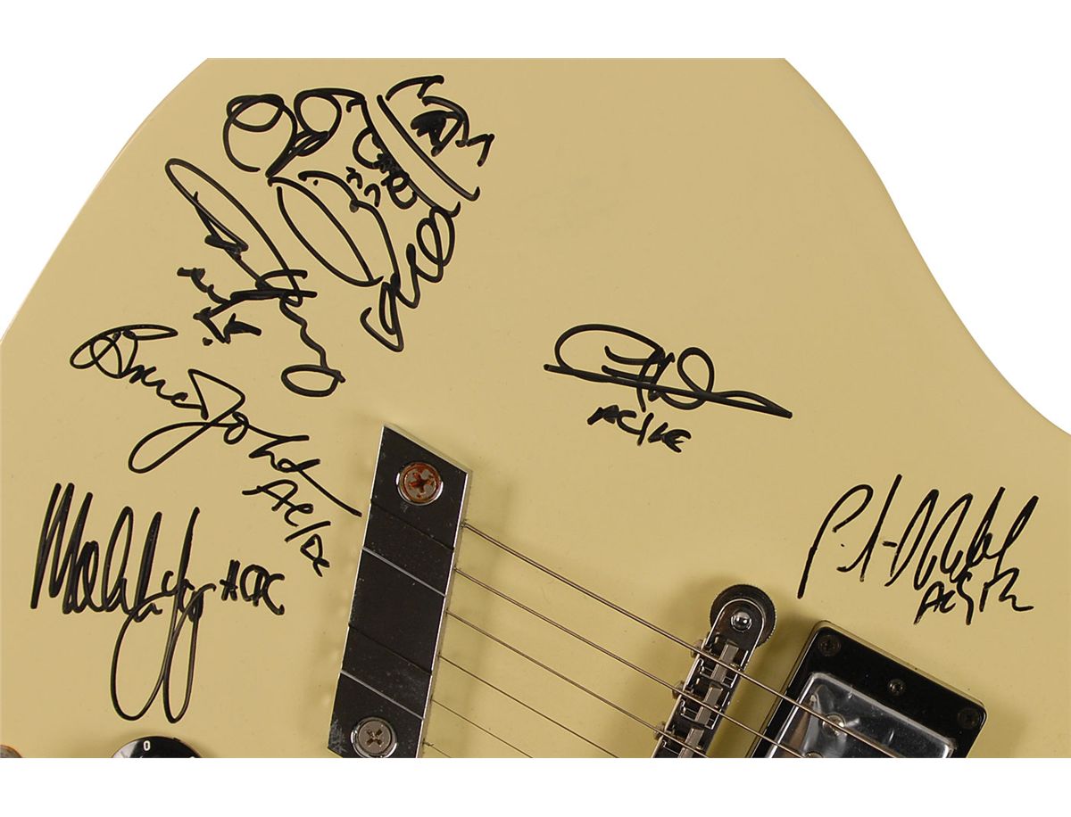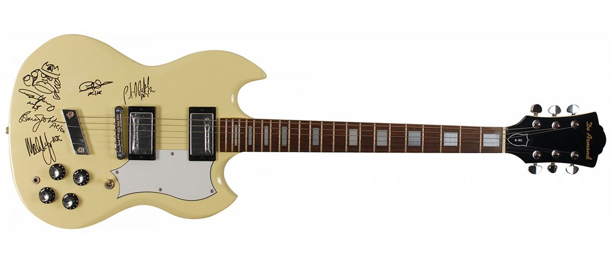 Cream-colored DeArmand S-65 model electric guitar, signed in-person on the body in black felt tip by Angus Young, adding a great self-portrait caricature, Malcolm Young, Brian Johnson, Cliff Williams, and Phil Rudd. In fine condition. Originally obtained by in-person specialist Mike Wehrmann.