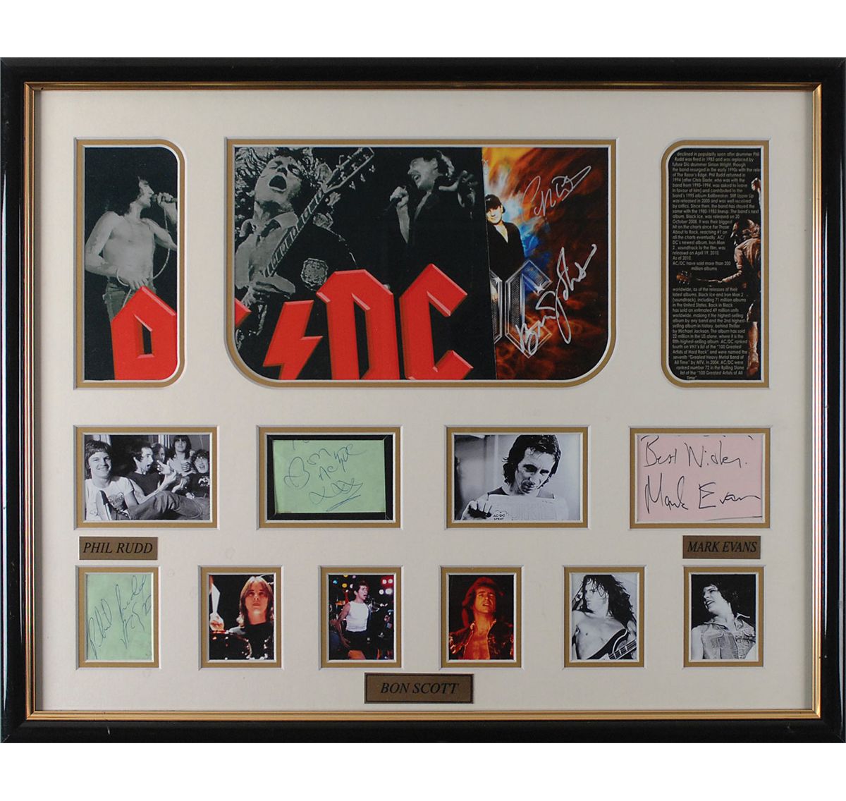 Ballpoint signature, “Bon AC/DC xxx,” on a light green album page; “Phil Rudd AC/DC,” on a light green album page; felt tip signature, “Best wishes, Mark Evans,” on a light pink album page; and a color photo of the band, signed in silver ink by Brian Johnson and Cliff Williams. All four items are double-matted and framed with eight photos to an overall size of 21.25 x 17.25. In fine condition. Any Scott signature from his time with the band is highly coveted by collectors.