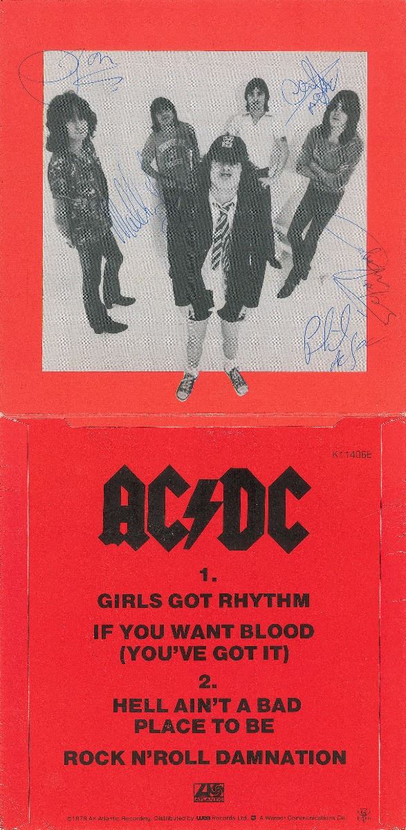Scarce 1979 UK Atlantic Records ‘double picture’ gatefold sleeve for the Girls Got Rhythm EP, signed on the gatefold image of the band in blue ballpoint by Bon Scott, Malcolm Young, Angus Young, Cliff Williams, and Phil Rudd. In fine condition. The record is not included. The song ‘Girls Got Rhythm’ was the second of three singles released in promotion of the band’s landmark 1979 album Highway to Hell. A very visually appealing, rarely seen format.