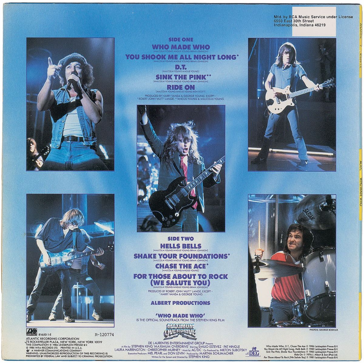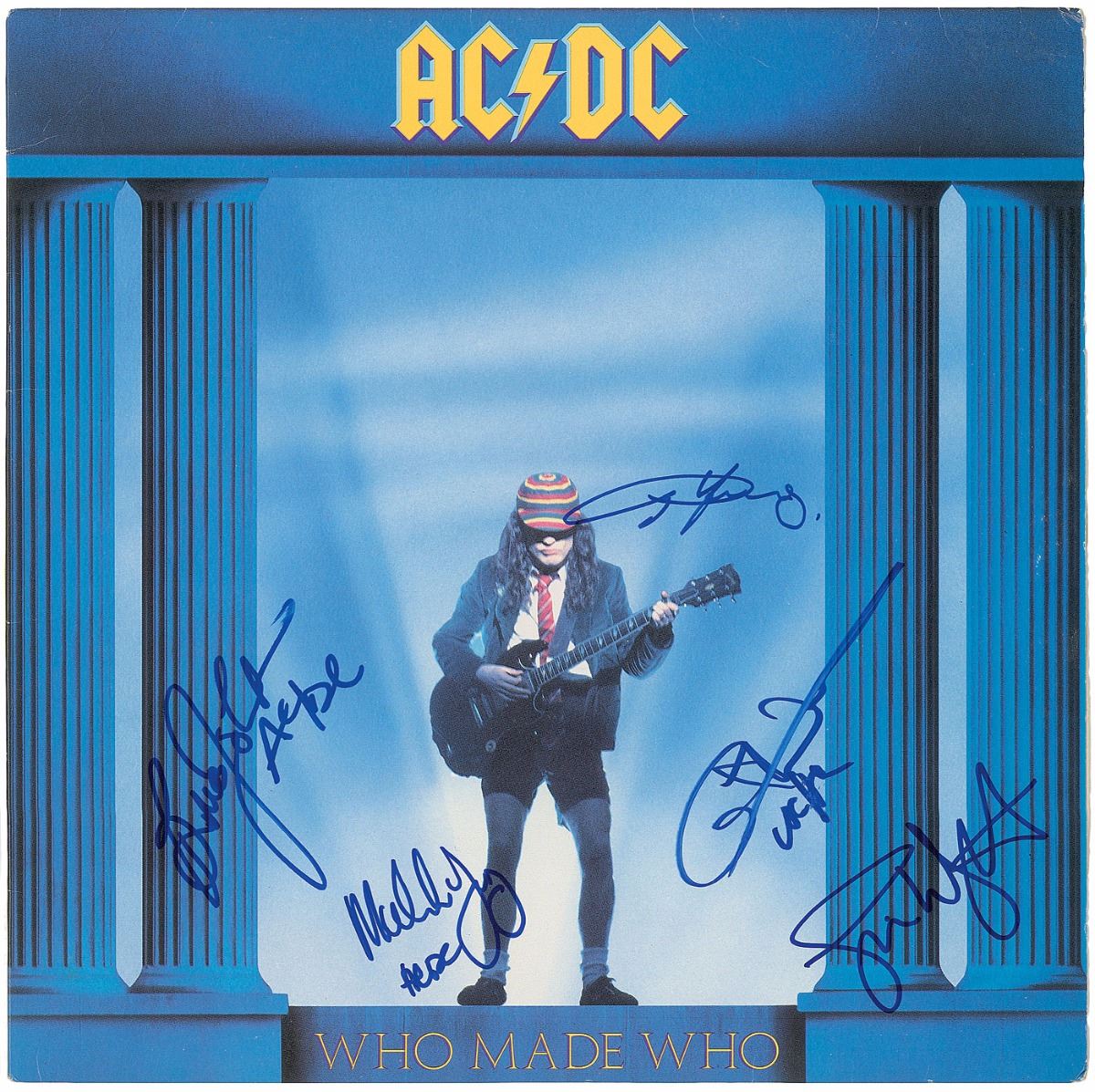Who Made Who album signed on the front cover in blue felt tip by Angus Young, Simon Wright, Brian Johnson, Malcolm Young, and Cliff Williams, with the latter three adding “AC/DC.” In fine condition. The record is included. Accompanied by a full letter of authenticity from REAL.