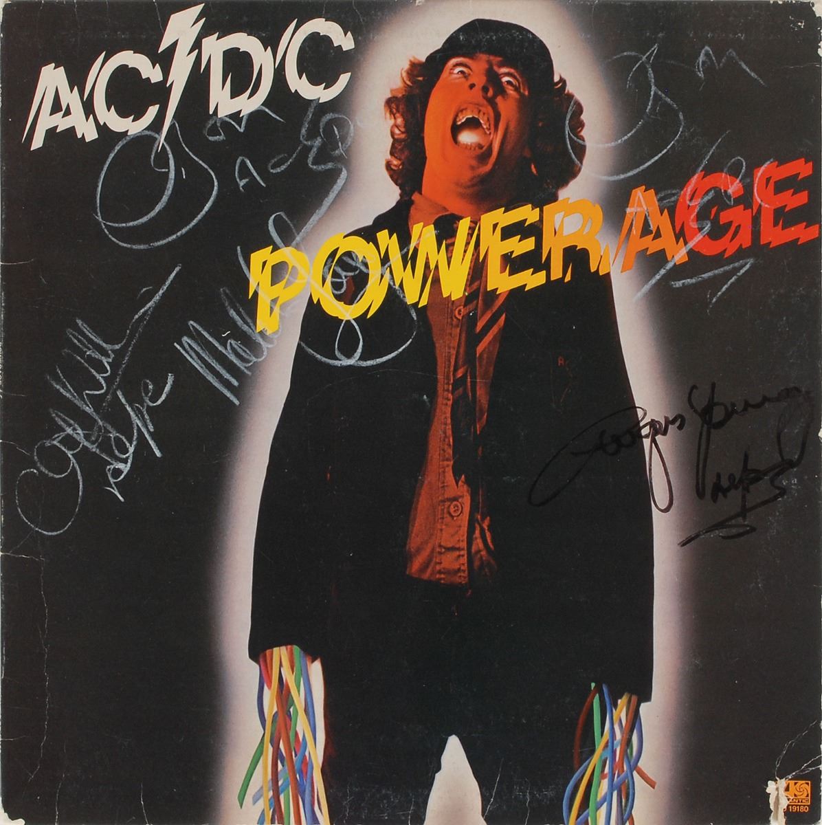 Powerage album signed on the front cover in white pencil by Cliff Williams, Malcolm Young, and Bon Scott, who signs twice, and in black felt tip by Angus Young. Also signed on the back cover in black ballpoint by Phil Rudd. Each member adds “AC/DC” to their signature. In very good to fine condition, with scattered light creasing and a discount cut to lower right corner. The record is not included.