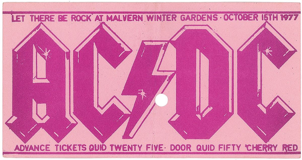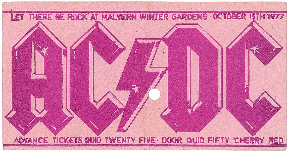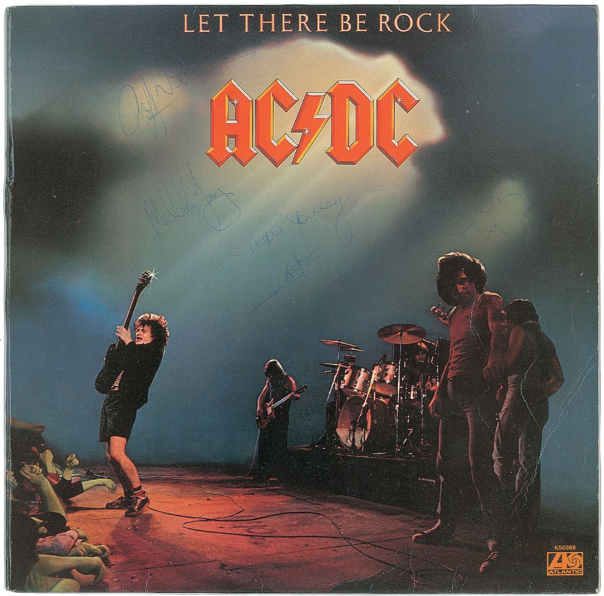 Sought-after Let There Be Rock album signed on the front cover in blue ballpoint by Cliff Williams, Malcolm Young, Angus Young, and Bon Scott, with the latter two adding “AC/DC” to their signatures. In fine condition, with some surface creasing and the signatures a shade light; moderate contrast to the Scott signature against the dark background. In addition to the record, also included are a pair of AC/DC tickets for a concert at Worcestershire’s Malvern Winter Gardens on October 15, 1977, a vintage AC/DC “Let There Be Rock!” sticker affixed to a clipped cardstock sheet, and a pair of flyers promoting the aforesaid AC/DC show at the Winter Gardens. Accompanied by a full letter of authenticity from REAL. Given Scott’s untimely death in 1980, items signed by the lead singer and his AC/DC cohorts are very scarce and extremely desirable. An exceptional fully signed example.