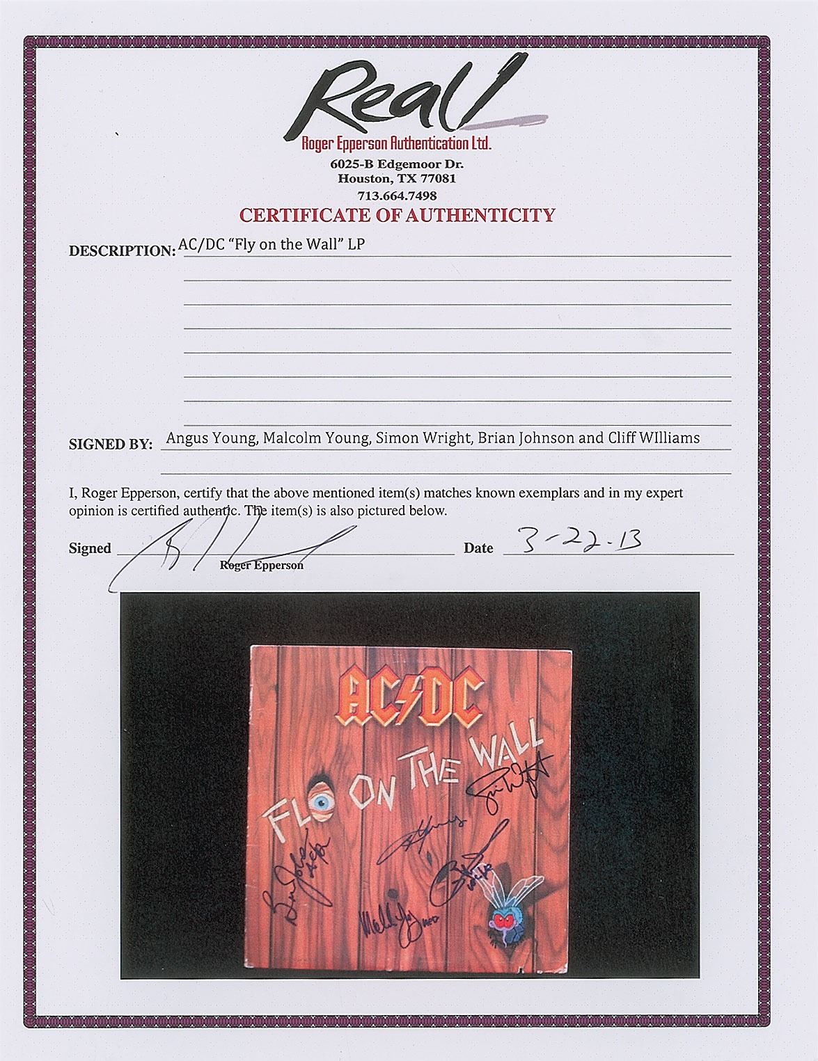 Fly on the Wall album by AC/DC, signed on the front cover in blue felt tip by Brian Johnson, Angus Young, Malcolm Young, Cliff Williams, and Simon Wright. In fine condition, with a few light creases and a discount cut to the bottom edge. The record is not included. Accompanied by a full letter of authenticity from REAL.