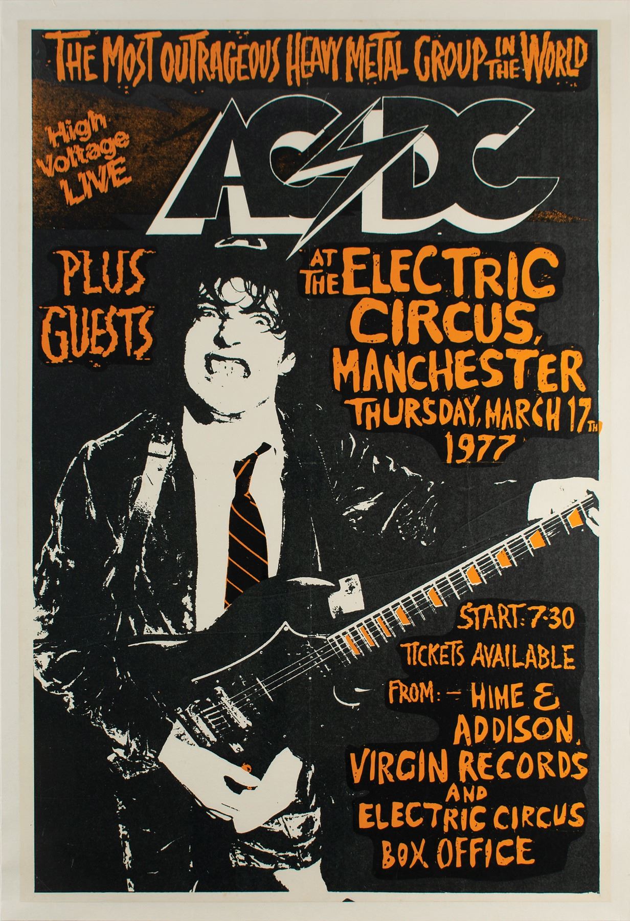 Rare original color 20 x 29.75 silkscreen poster for an AC/DC concert at The Electric Circus in Manchester, England, on March 17, 1977, as part of their Dirty Deeds Done Dirt Cheap, which features a large image of Angus Young playing guitar and gritting his teeth under the band’s logo and surrounded by bold orange text listing ticket and venue information, as well as proclaiming: “The Most Outrageous Heavy Metal Group in the World, High Voltage Live.” The poster has been professionally restored and is now archivally linen-backed to an overall size of 21.5 x 31. Rolled and in fine condition. Accompanied by a certificate of authenticity from former Warner Bros. record executive Jeff Gold of Recordmecca.
