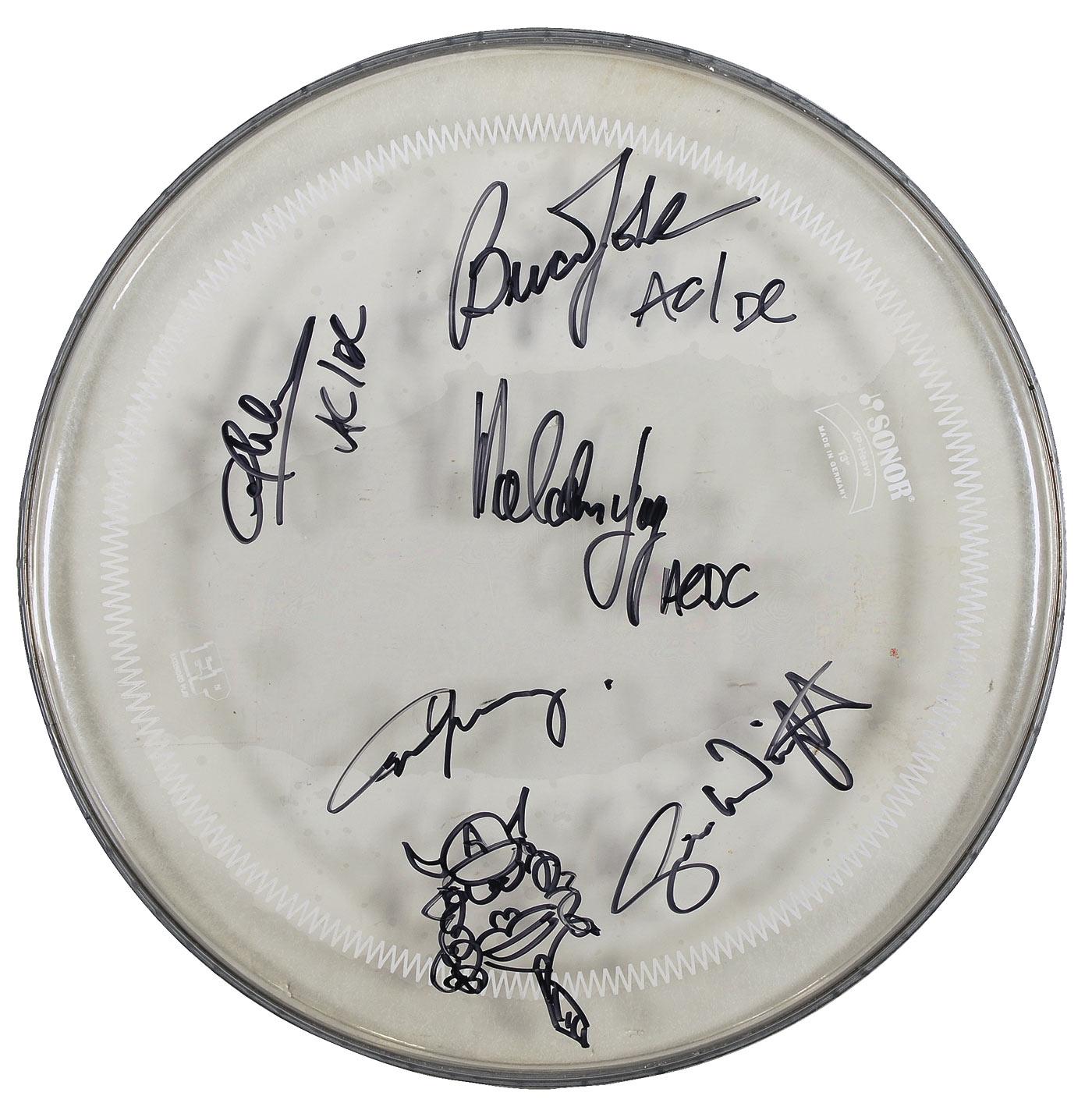 Unused 13” Sonor drumhead, signed in black felt tip by Angus Young, who adds a full caricature of himself, Malcolm Young, Cliff Williams, Simon Wright, and Brian Johnson. In fine condition. Pre-certified Roger Epperson/REAL and RRAuction COA.