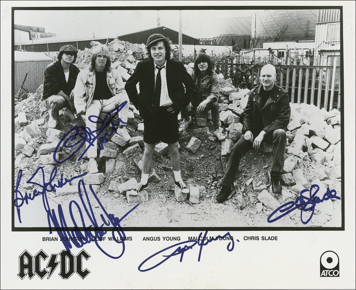 Glossy 10 x 8 ATCO publicity group photo, signed in blue felt tip by Angus Young, Malcolm Young, Brian Johnson, Chris Slade, and Cliff Williams. In fine condition, with a few scattered light surface dings and creases. Pre-certified Roger Epperson/REAL and RRAuction COA.