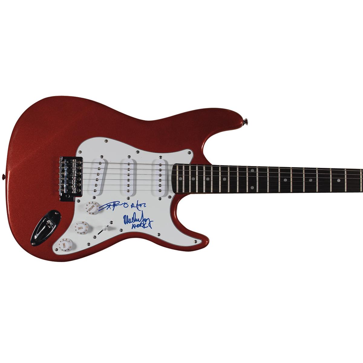 Red-bodied Stedman Pro ‘stratocaster-style’ electric guitar, signed on the white pickguard in blue felt tip by Angus and Malcolm Young, both adding the band’s name after their signatures. In fine condition. Oversized.