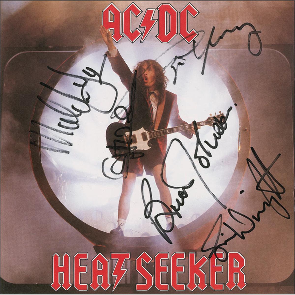 45 rpm record sleeve for Heat Seeker, signed in black felt tip by Angus Young, Malcolm Young, Cliff Williams, Brian Johnson, and Simon Wright. In fine condition. The record is included. Consignor notes that the single was signed at Arlanda Airport, Stockholm on March 26, 1988.