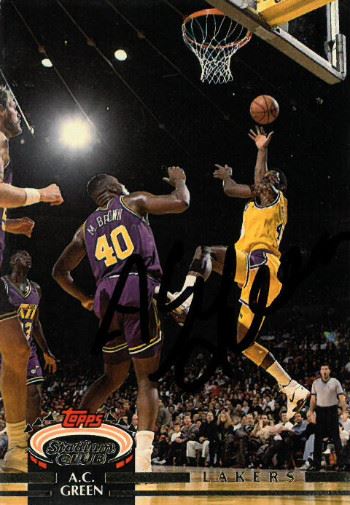 AC Green played in more consecutive games than any other player in NBA and ABA history. With 1,192 straight games played, he earned the nickname "Iron Man". He played for the Los Angeles Lakers, Phoenix Suns, Dallas Mavericks and Miami Heat. He played in 1278 out of 1281 games in his career (99.8%), with the three he missed coming in his second season, 1986–87. AC Green has hand signed this Los Angeles Lakers 1990-91 Topps Stadium Club Basketball Trading Card #172. Certificate of Authenticity from Athlon Sports Collectibles.
