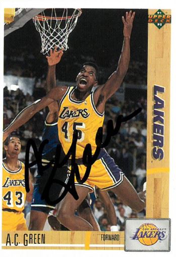 AC Green played in more consecutive games than any other player in NBA and ABA history. With 1,192 straight games played, he earned the nickname "Iron Man". He played for the Los Angeles Lakers, Phoenix Suns, Dallas Mavericks and Miami Heat. He played in 1278 out of 1281 games in his career (99.8%), with the three he missed coming in his second season, 1986–87. AC Green has hand signed this Los Angeles Lakers 1991-92 Upper Deck Basketball Trading Card #177. Certificate of Authenticity from Athlon Sports Collectibles.