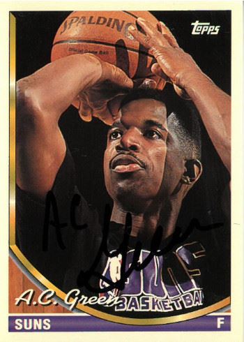 AC Green played in more consecutive games than any other player in NBA and ABA history. With 1,192 straight games played, he earned the nickname "Iron Man". He played for the Los Angeles Lakers, Phoenix Suns, Dallas Mavericks and Miami Heat. He played in 1278 out of 1281 games in his career (99.8%), with the three he missed coming in his second season, 1986–87. AC Green has hand signed this Phoenix Suns 1994-95 Topps Basketball Trading Card #227. Certificate of Authenticity from Athlon Sports Collectibles.