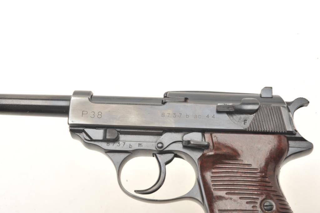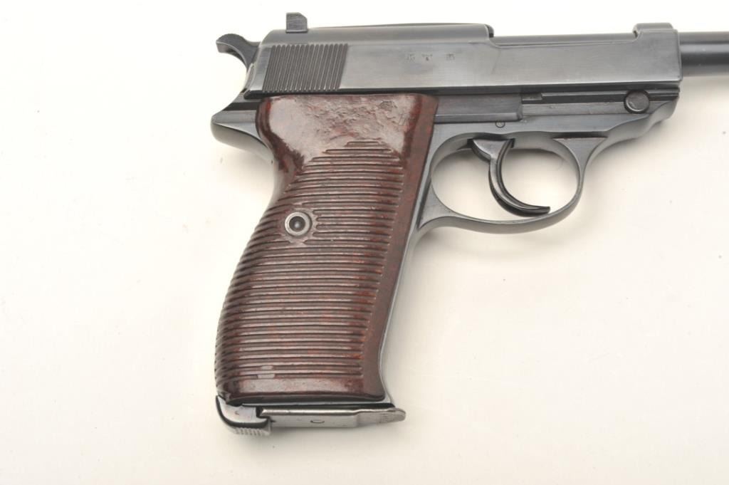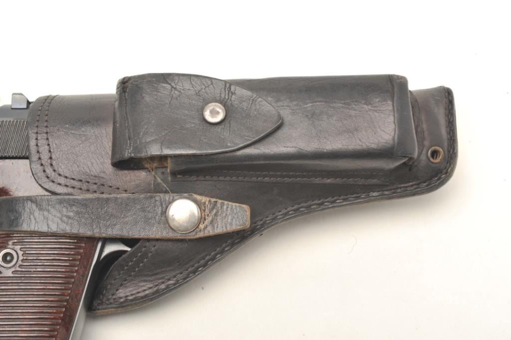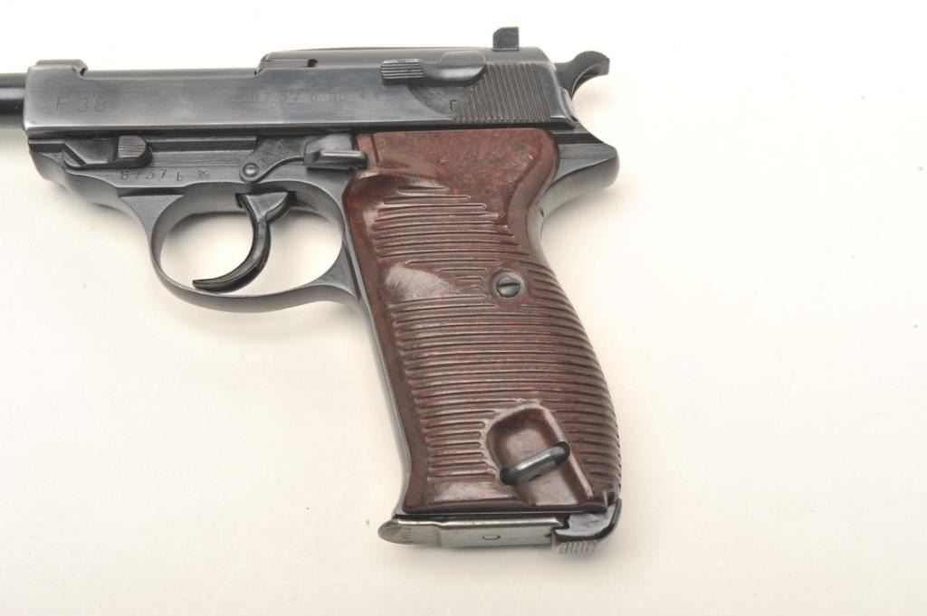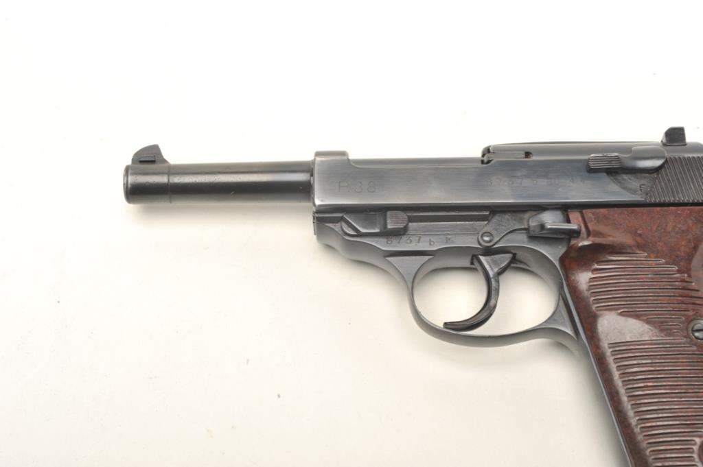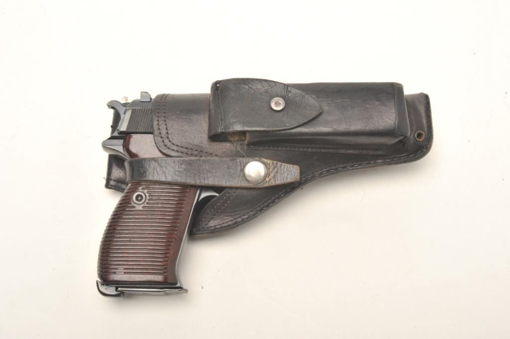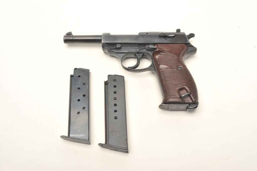 AC44 marked P.38 showing very good old refinish of which 98% remains along with crisp grips and good markings along with bright bore. Accompanied by a non-original and two later clips. Good shooter. (C&R/PPT)Est.: $250-$500