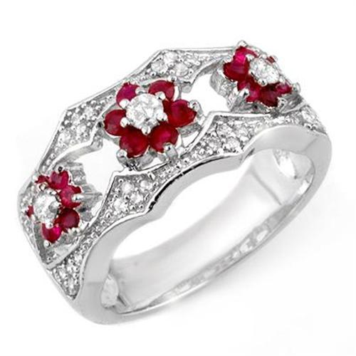 Add a bit of flair to any jewelry. This ring features three floral motifs, each set with five prong-set round rubies surround the shinny diamond. Pave-set diamonds complete the design as the border.<BR><BR>This July birthstone is believed to bring courage, power, and good fortune to its owner because of the glowing red color.