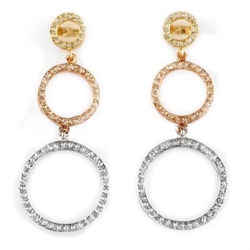 with these three-tone circle drop earrings.Crafted of white,yellow and rose gold.Each earring features a pave set of round diamonds which add a little touch of sparkle to them.<BR><BR>For thousands of years, diamonds, as the birthstone of April, are known for its elegance, brilliance and purity, and also as a woman's best friend.