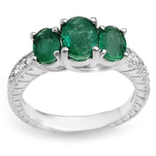 A triple threat of gems.This ring features three beautiful oval emeralds in prong settings center the ring, and round prong set diamonds accent each end emeralds. All are set on a white gold band<BR><BR>As the birth stone of May, emerald is believed to empower the owner with foresight into the future, good fortune, youth and rebirth.