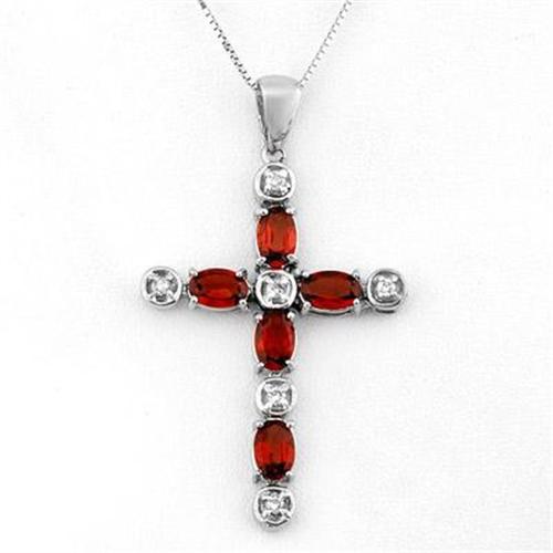 style highlight this lovely cross. This cross pendant of white gold displays diamonds and oval-cut garnet gemstones in prong settings.<BR><BR>The birthstone of January that comes in a rainbow of color was thought to gives its owner
