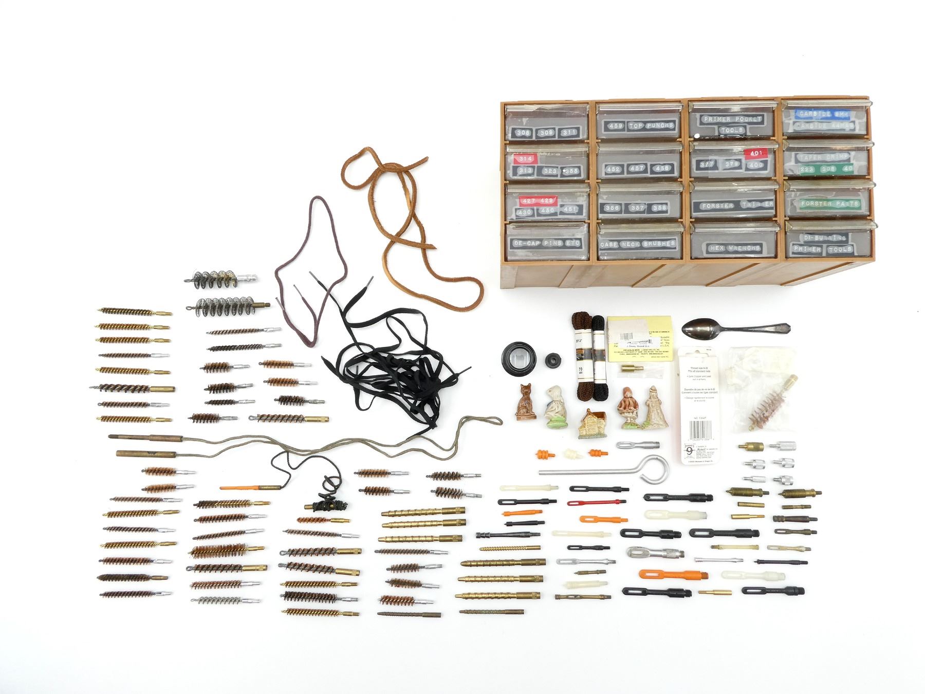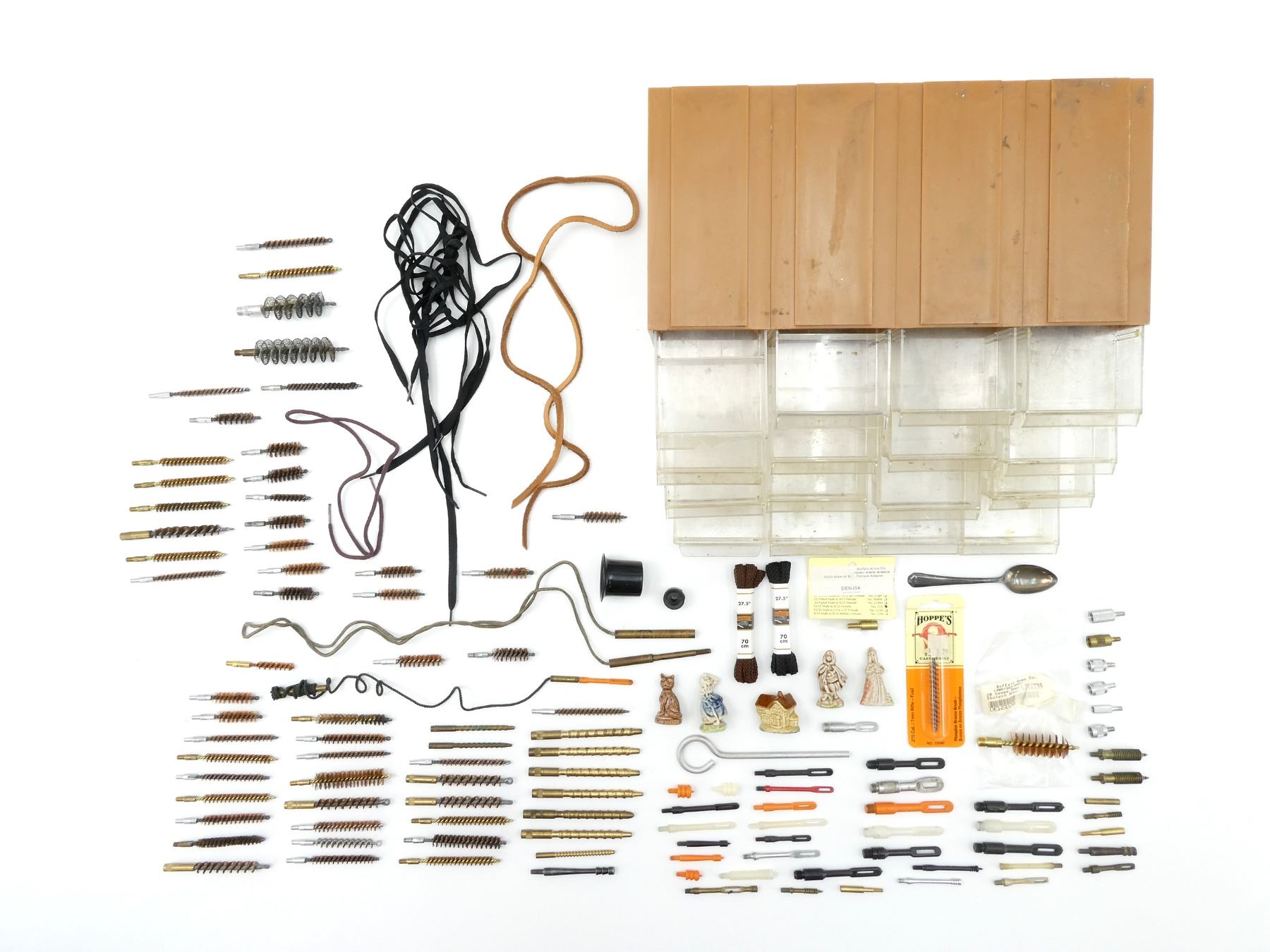 LOT INCLUDES; (1) ACCESSORY ORGANIZER, 16 COMPARTMENTS, OVERALL LENGTH APPROX. 12.25" X 6" X 5 5/8" & (1) BAG OF ASSORTED ACCESSORIES, INCLUDING; CLEANING BRUSHES, CLEANING JAGS, LACES, ETC. SEE PHOTOS.