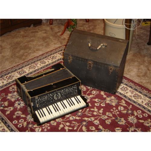 THIS ACCORDION HAS A TRUNK CASE. IT WAS MADE IN GERMANY. HAS BEEN AROUND THE WORLD AND WORLD WAR II. IT STILL PLAYS .