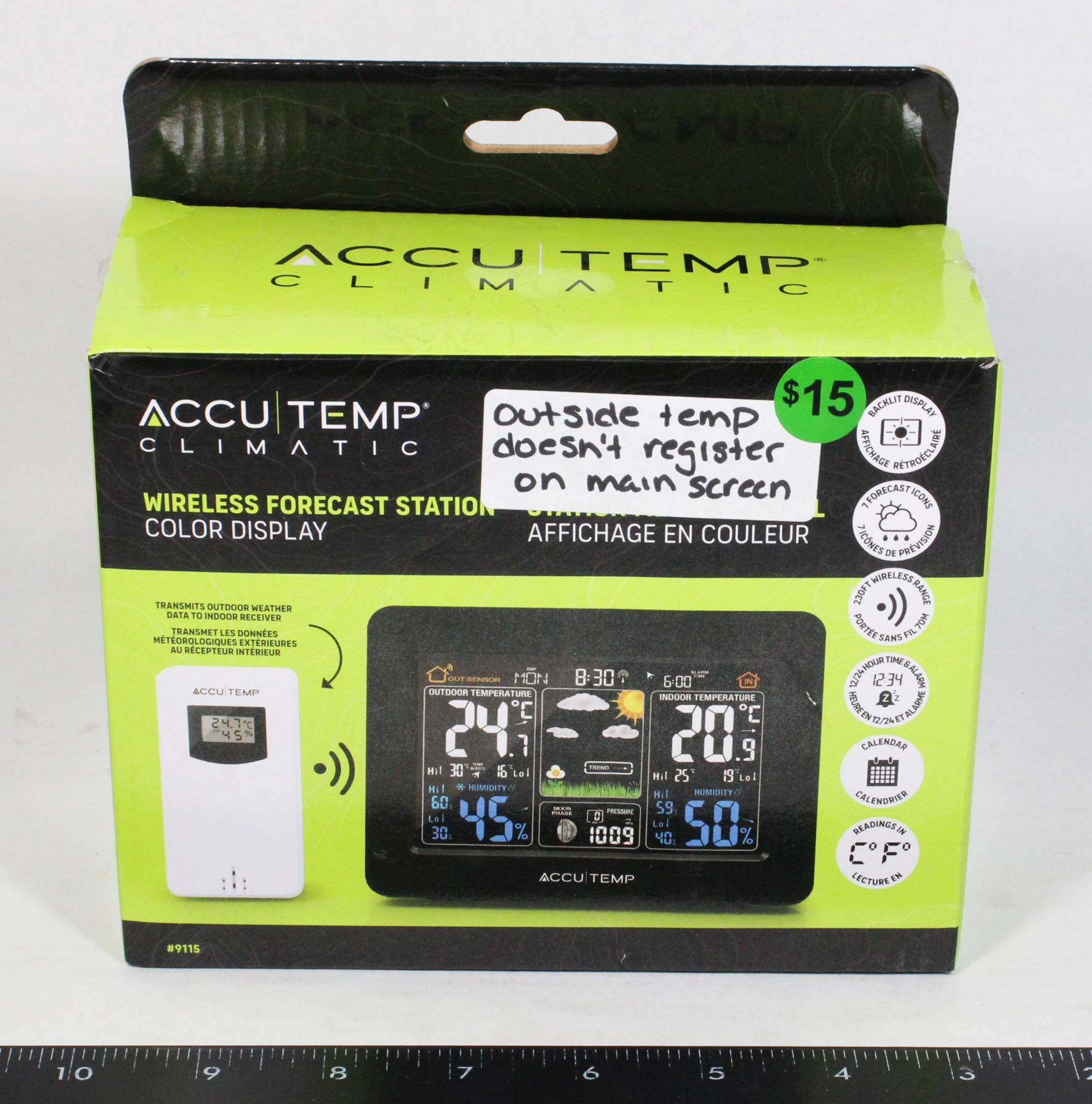 WIRELESS FORCAST STATION. REPORTED OUTSIDE TEMP DOESN'T REGISTER ON MAIN SCREEN. SOLD AS IS